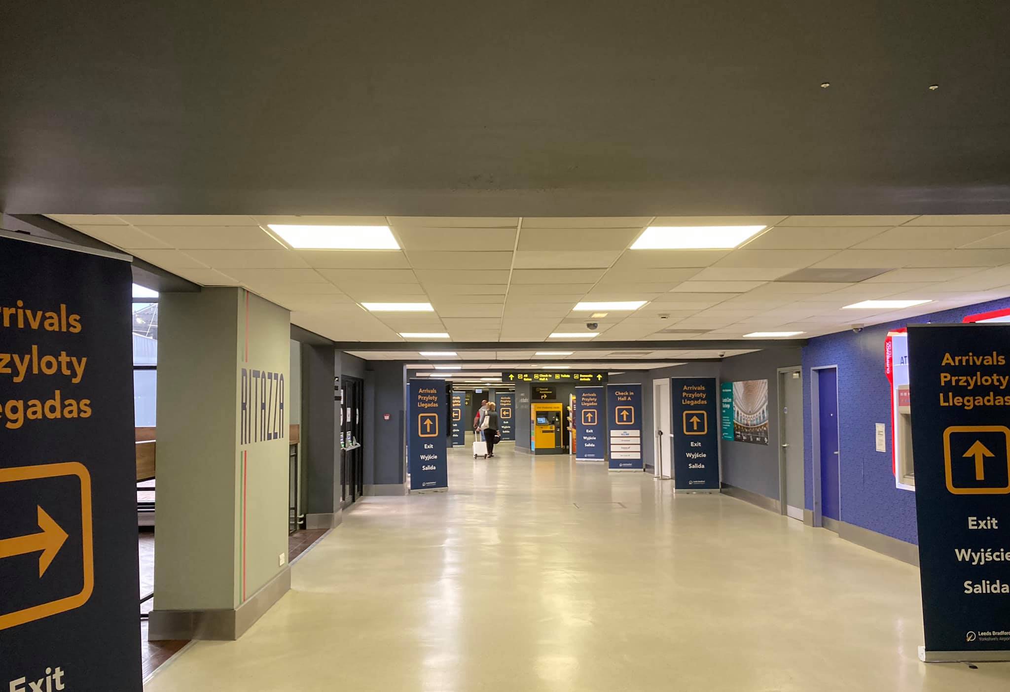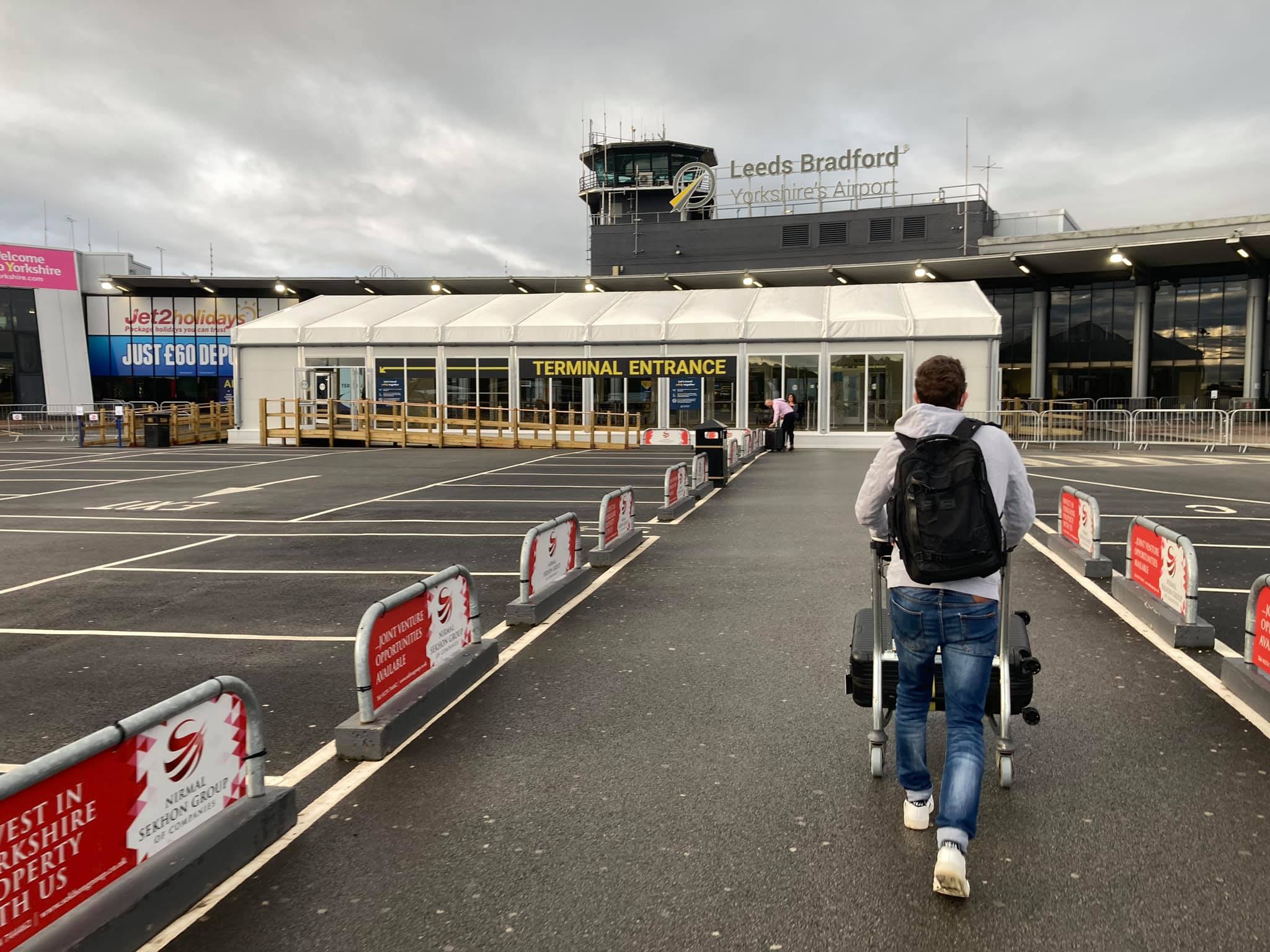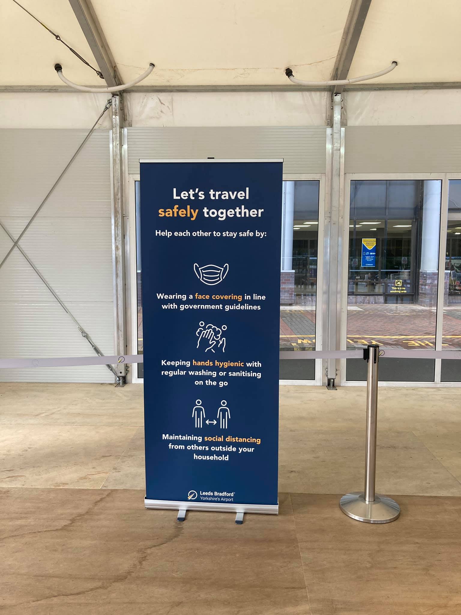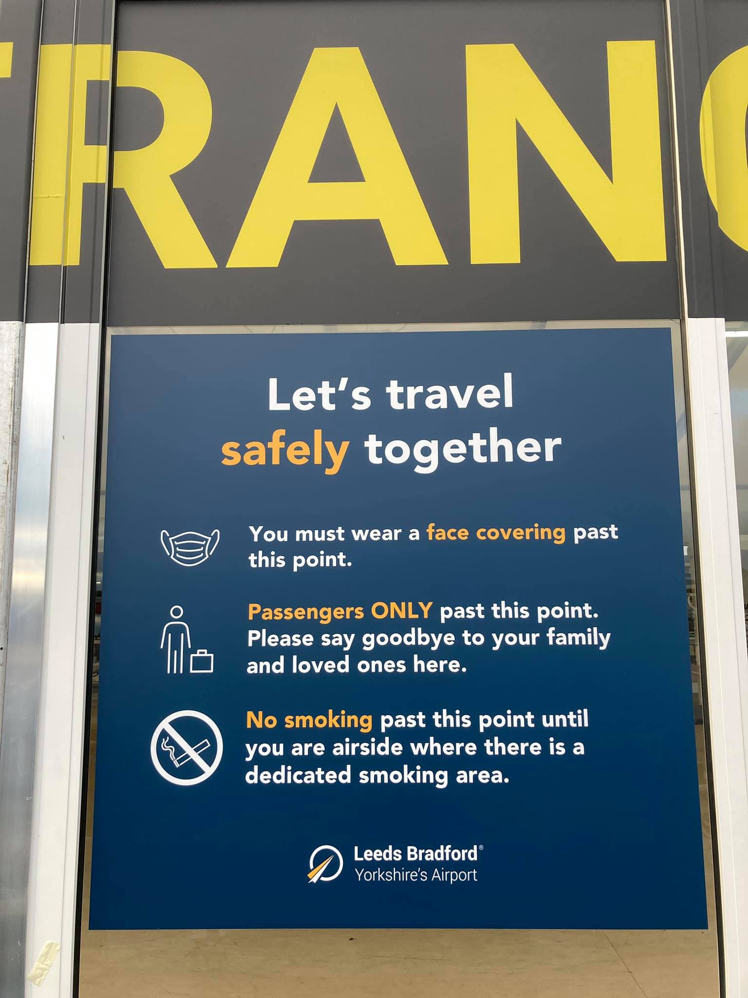 飛行當天來到Leeds Bradford空蕩蕩,送行親友無法進到航站樓,必須在建築物外就止步,乘客出示電子機票後才能進到航站樓。