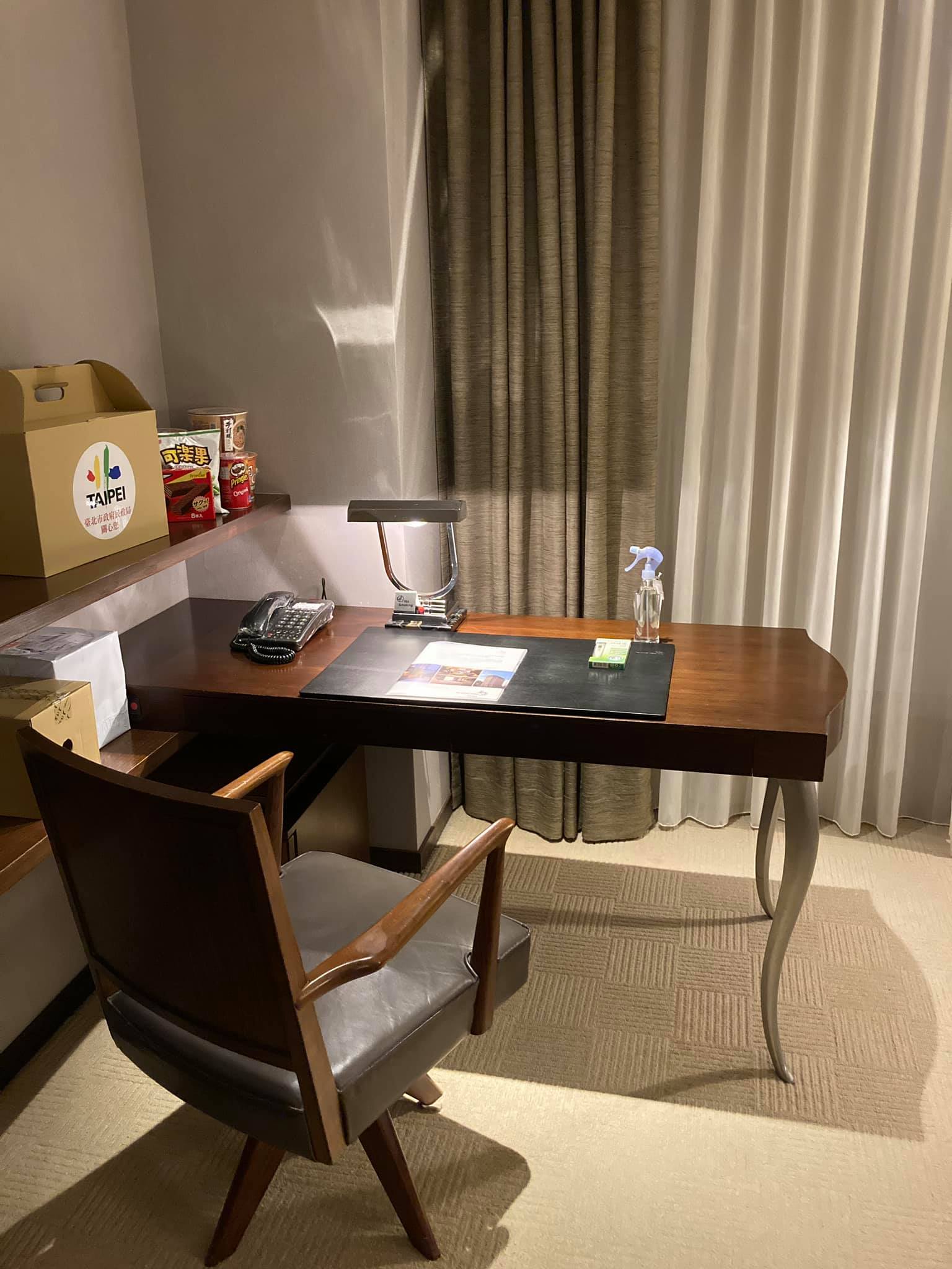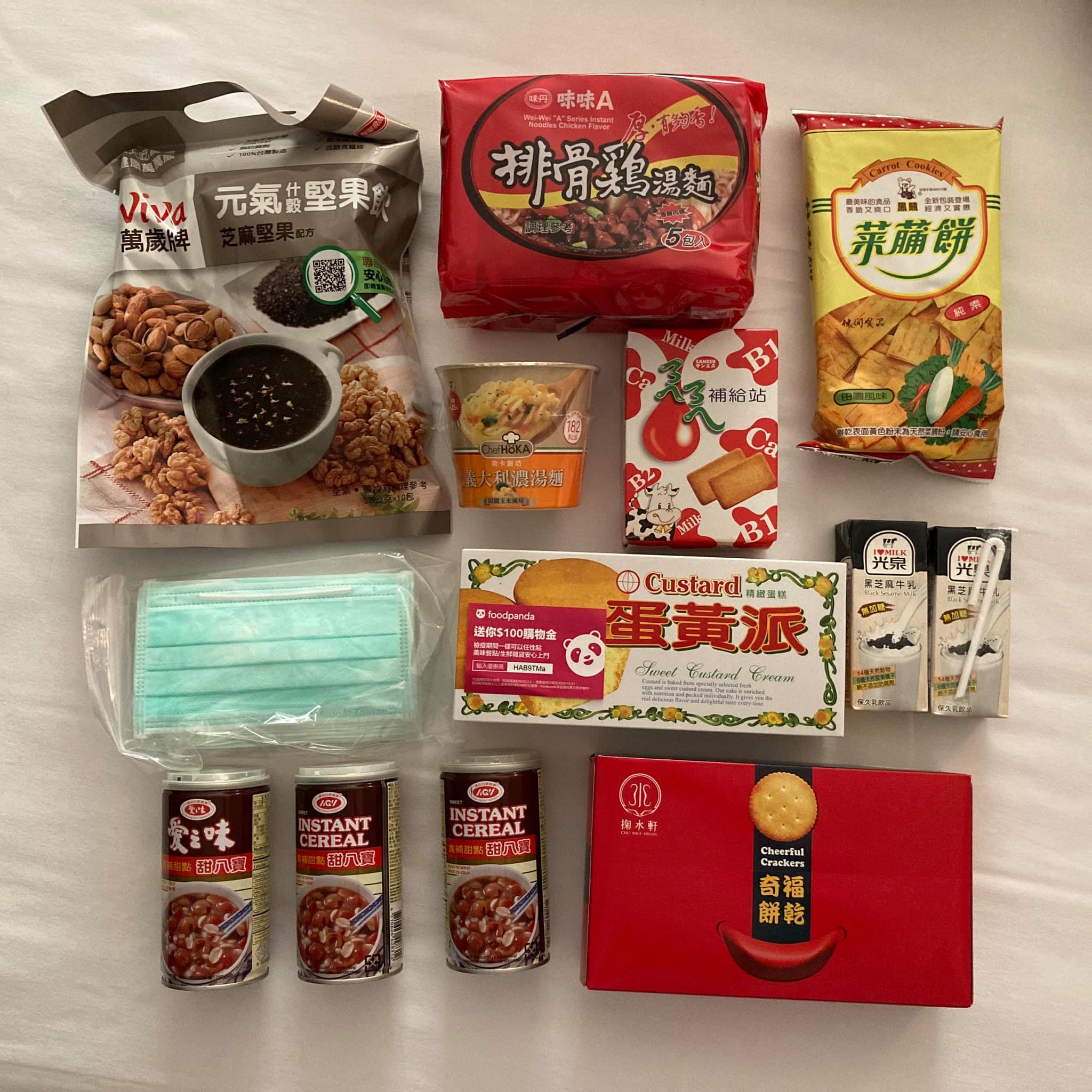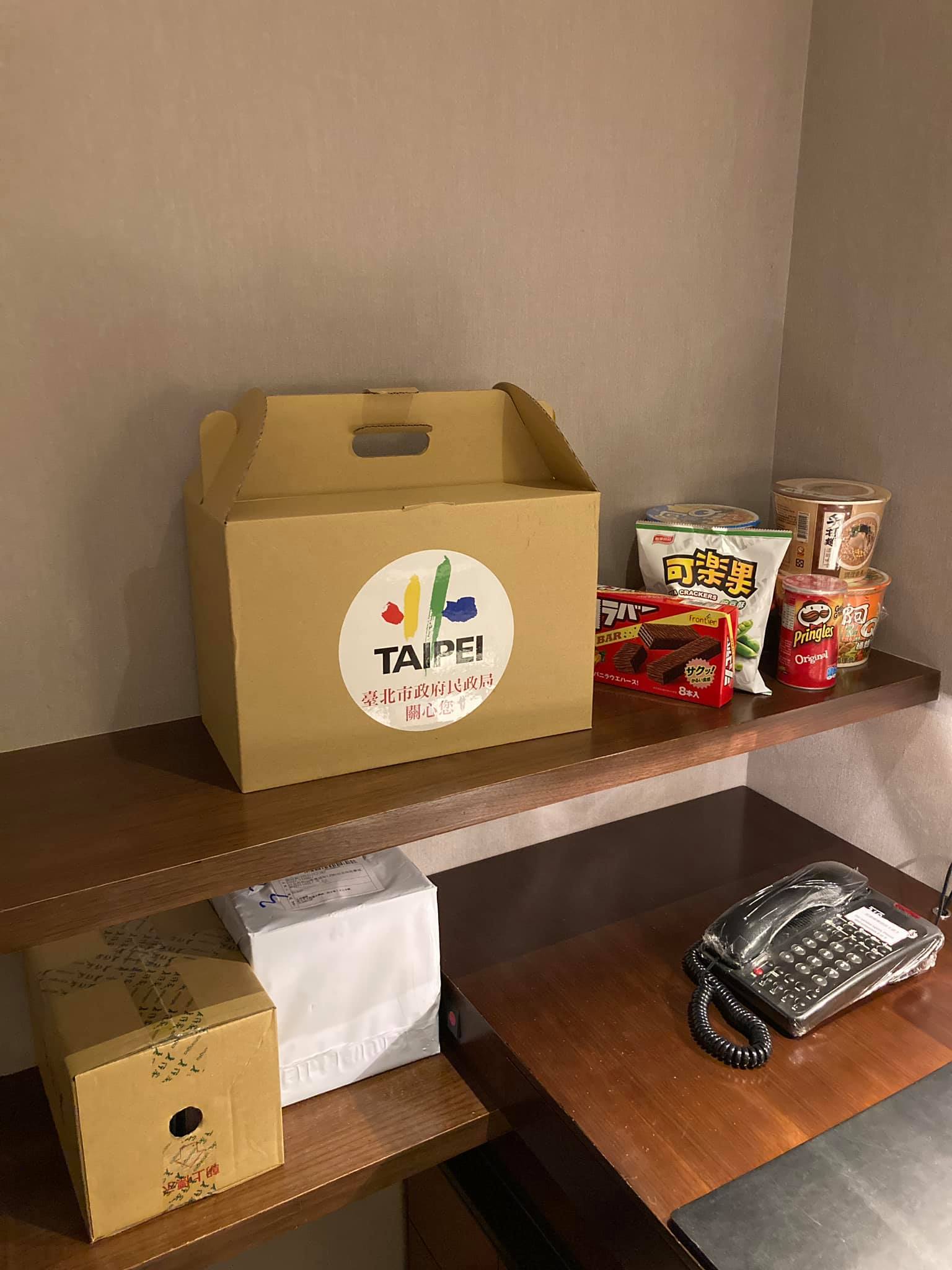 除了台北市政府給的防疫包以外,飯店也免費贈送了一些零食和泡麵,這些都是英國想買也買不到的寶貝!也備有體溫計,消毒酒精噴霧,簡單的清潔用品,曬衣繩及衣架。而我在幾天前的網購包裹也已經比我先到了,在房間裡等我。