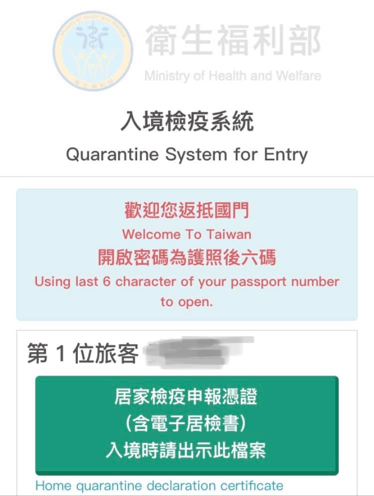 ➡點擊憑證網址,使用護照後6碼登入獲取「居家檢疫申報憑證」