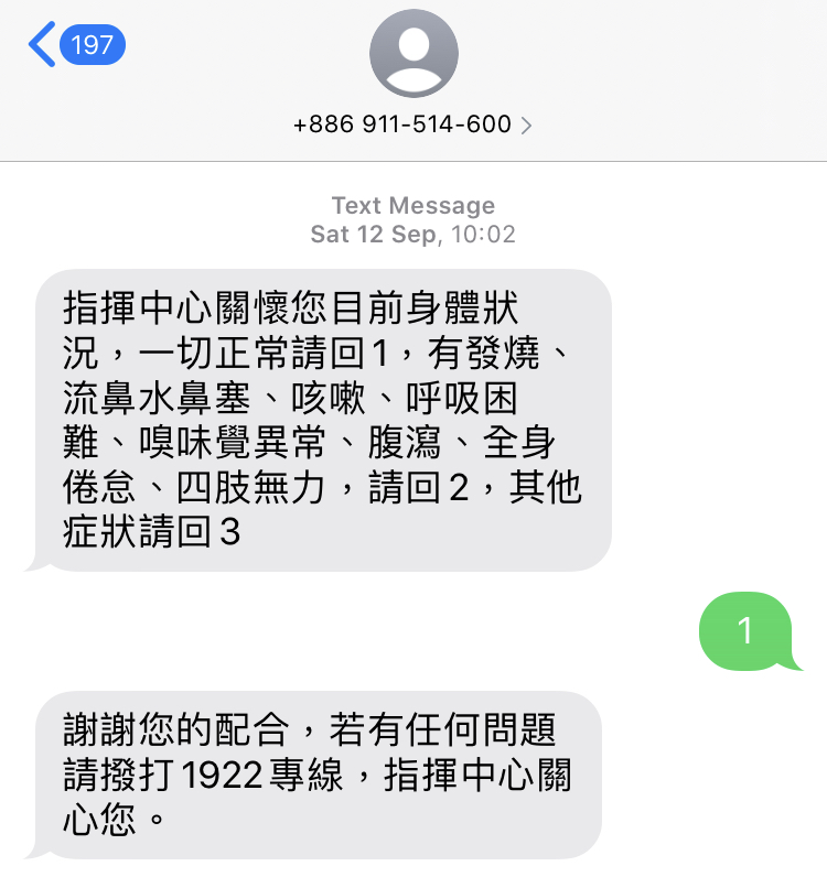 ✓每天早上10:00收到簡訊,自行以數字回傳健康狀況