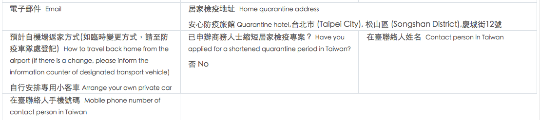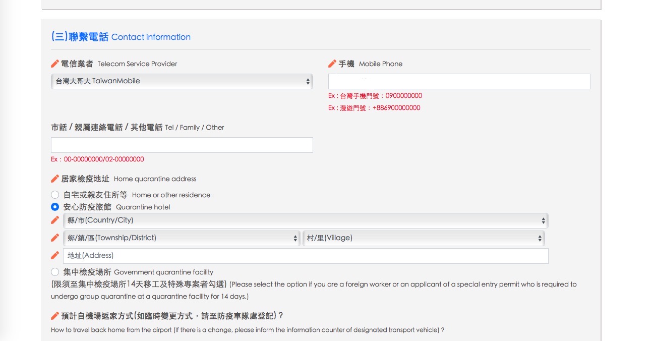 ✎市話/親屬聯繫電話/其他電話,我填寫的是防疫旅館的電話。