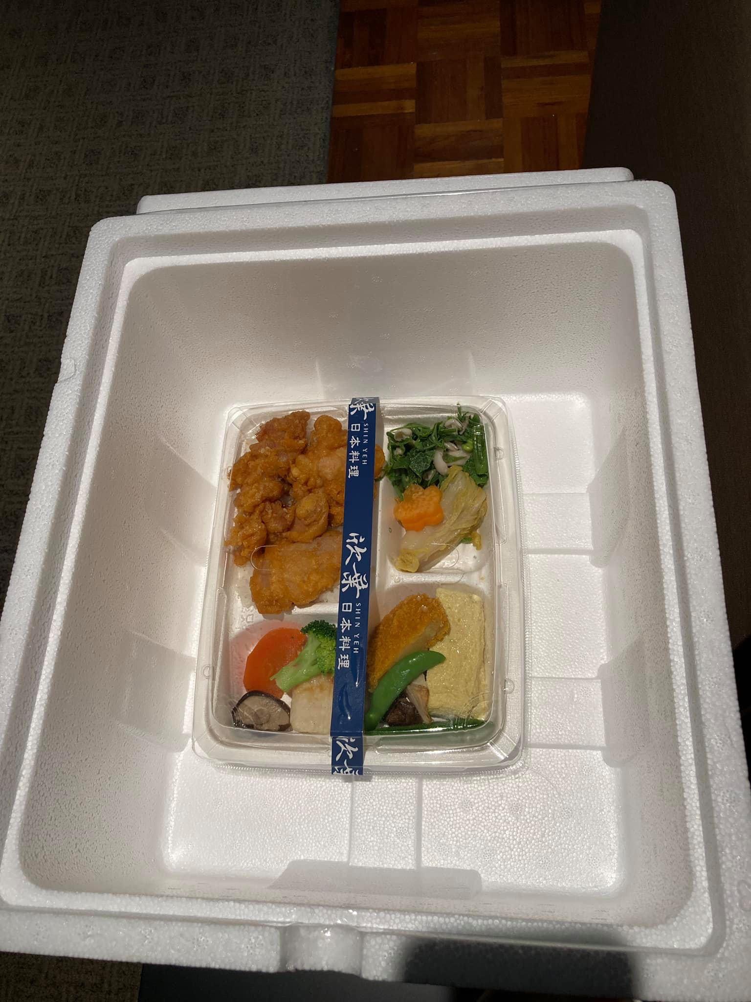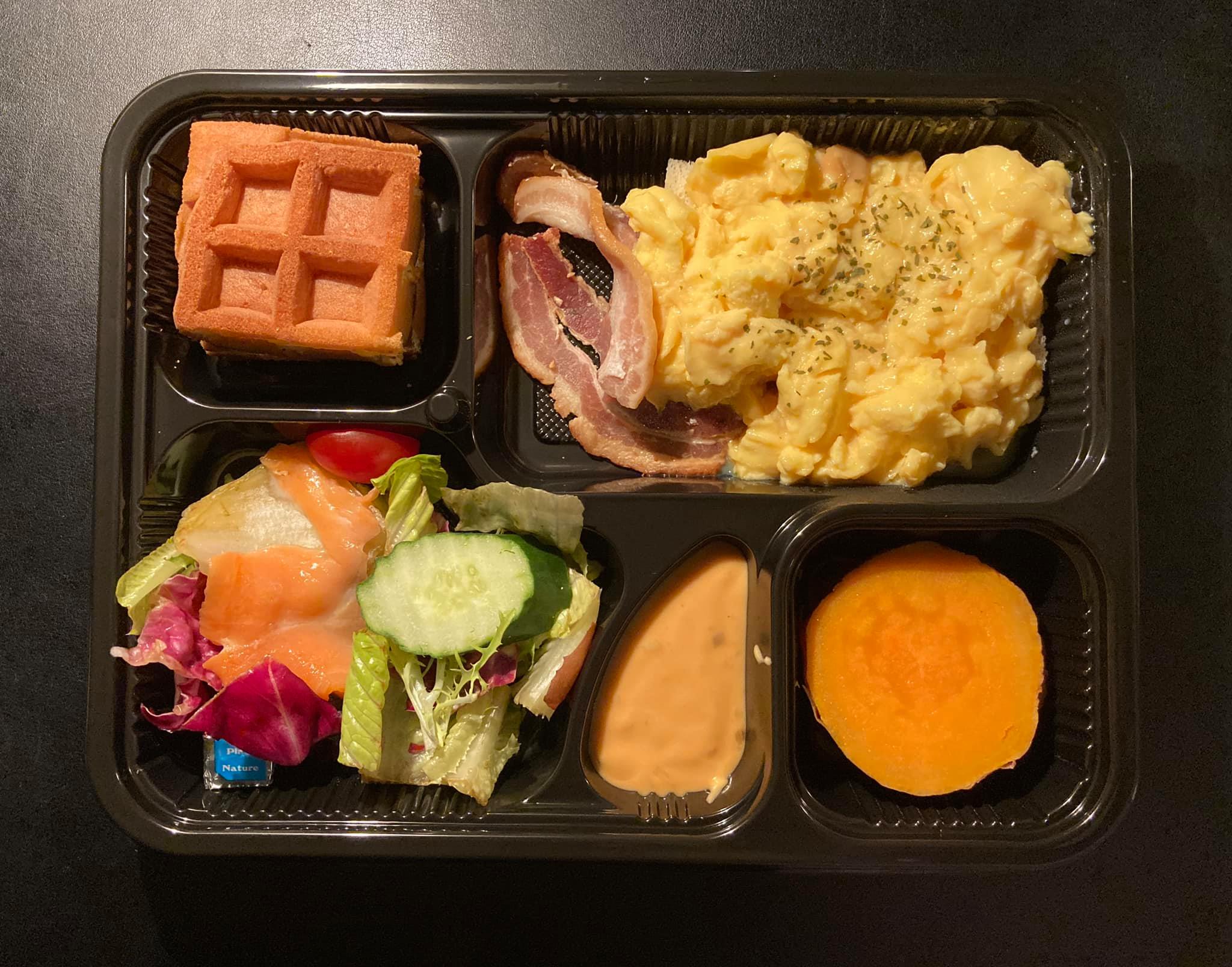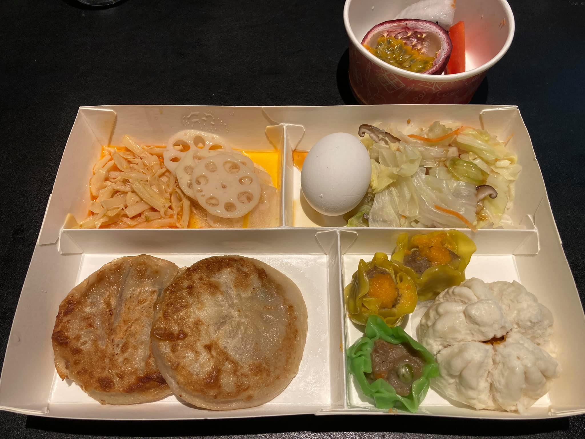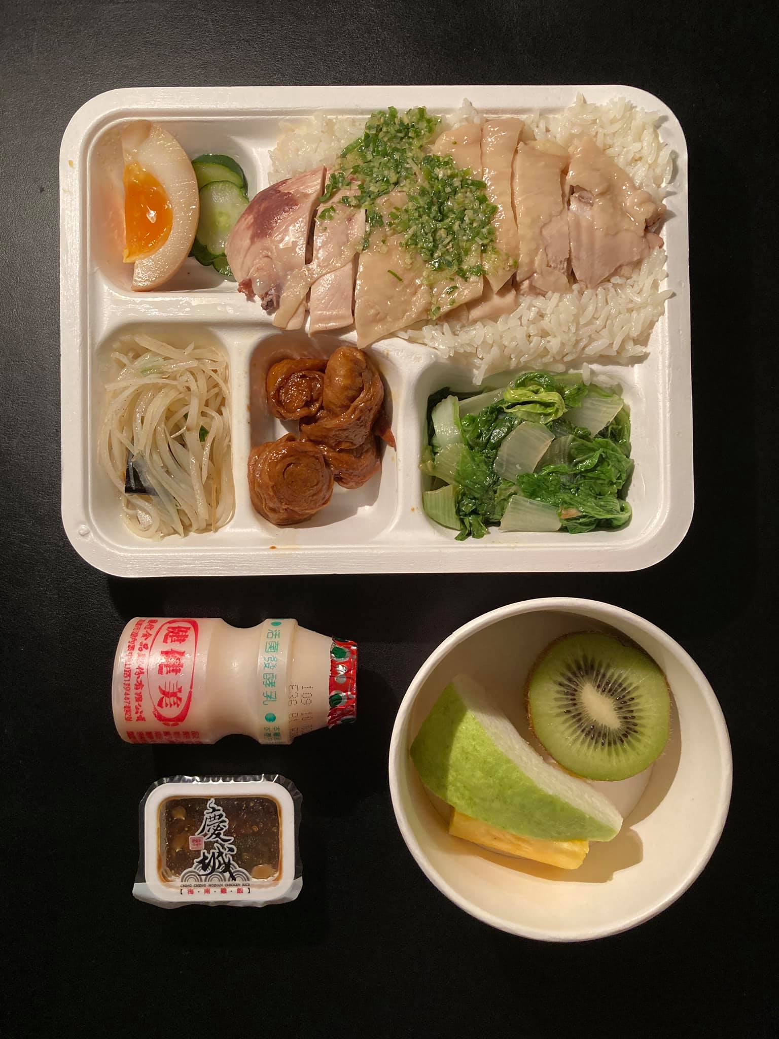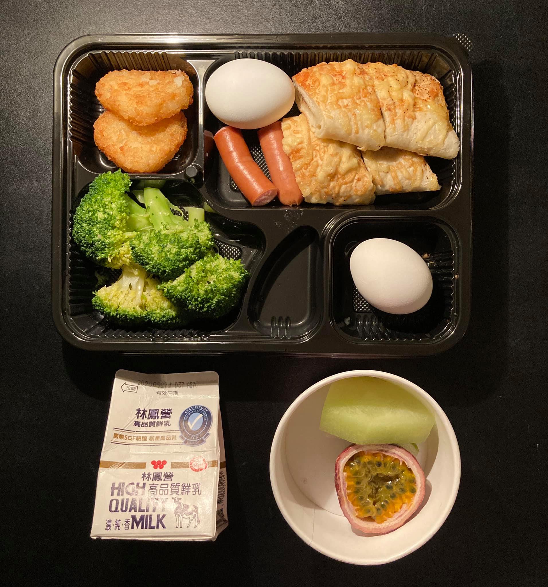 飯店費用包含了每日三餐,早餐和午餐都是由飯店廚房烹煮,晚餐則是提供菜單幫忙訂購附近餐廳或店家的便當,餐餐都有附水果。如果有另外想吃的食物或飲料可以使用外送平台訂購,飯店採取無接觸送餐方式,將餐點放在門口。如果是需要保溫的食物會特別存放在保麗龍盒子裡。