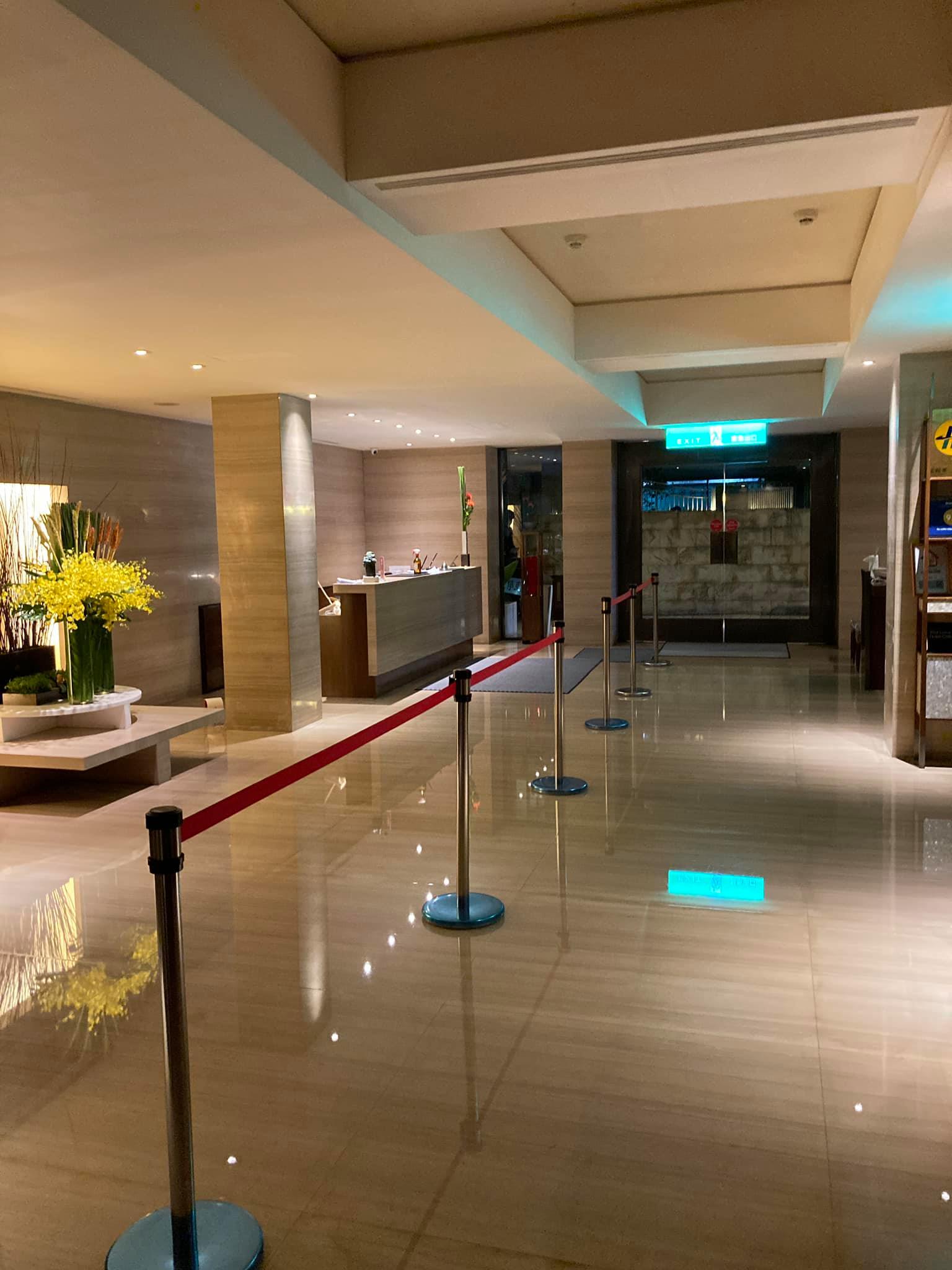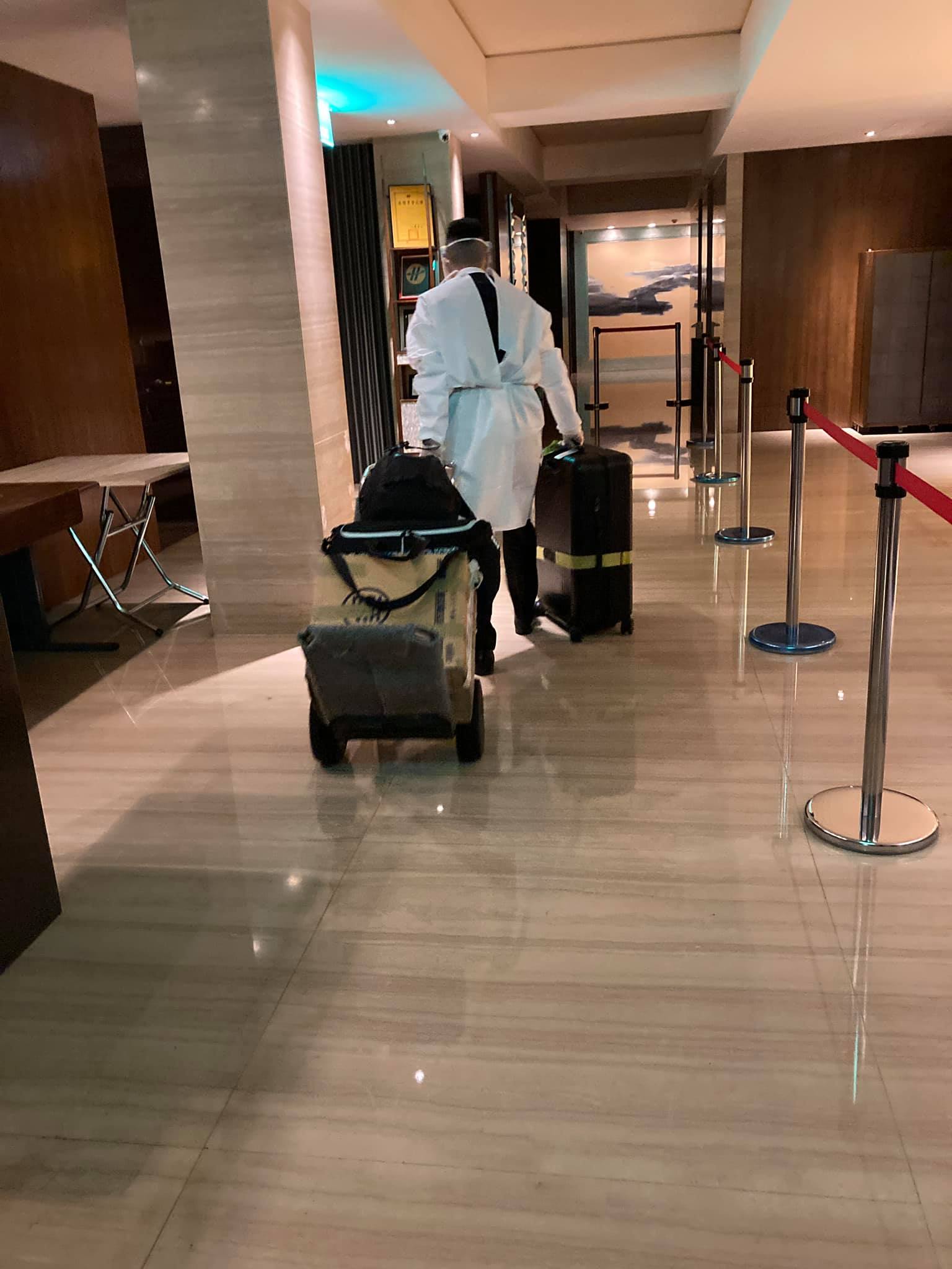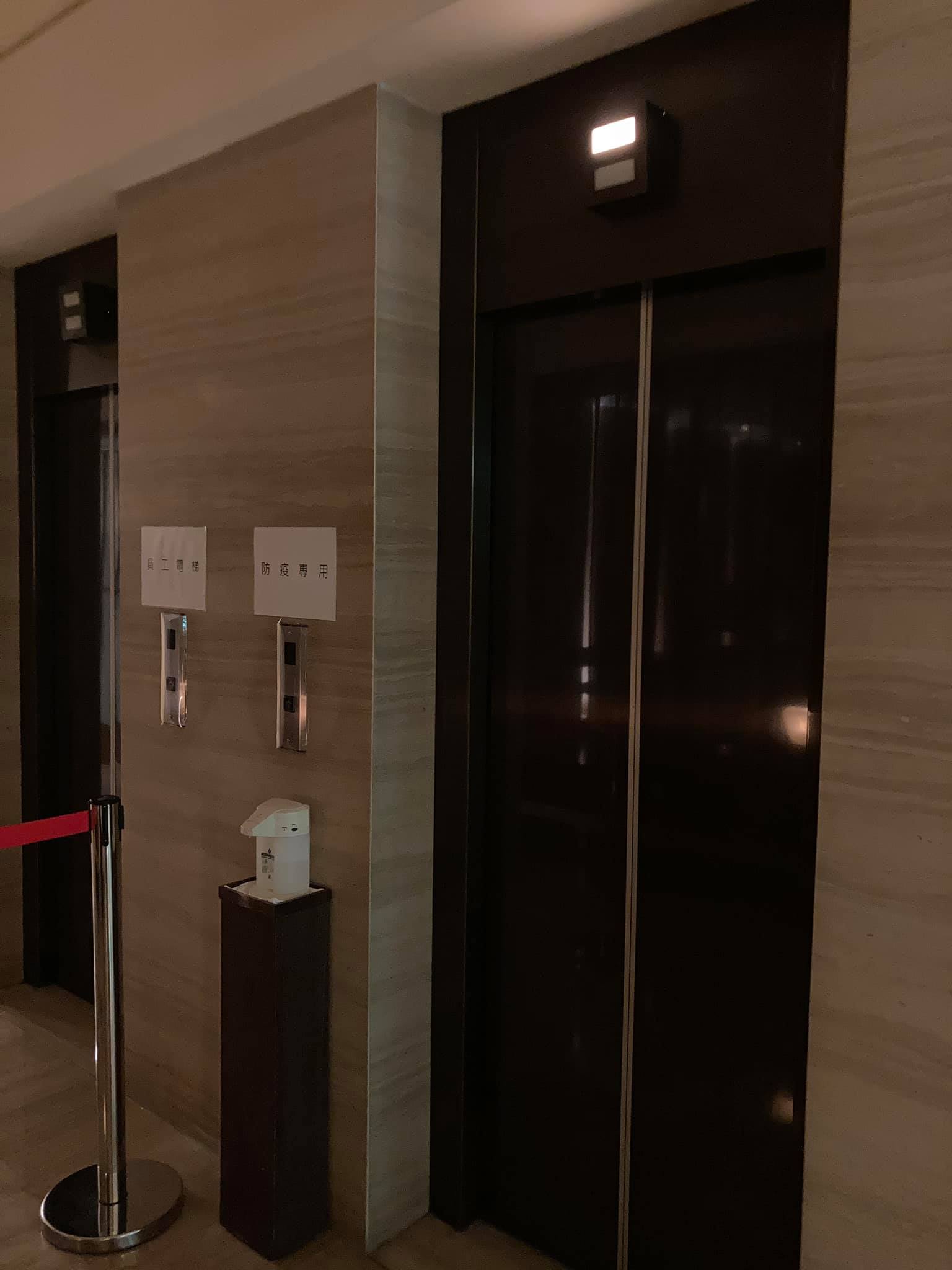 ➡到了飯店大廳後,飯店人員為所有行李噴灑消毒液,幫忙我送行李到房間。我的雙手用酒精消毒,然後飯店人員為我量體溫,確認沒有發燒後,告知房號,並引導我自行上樓進房間。