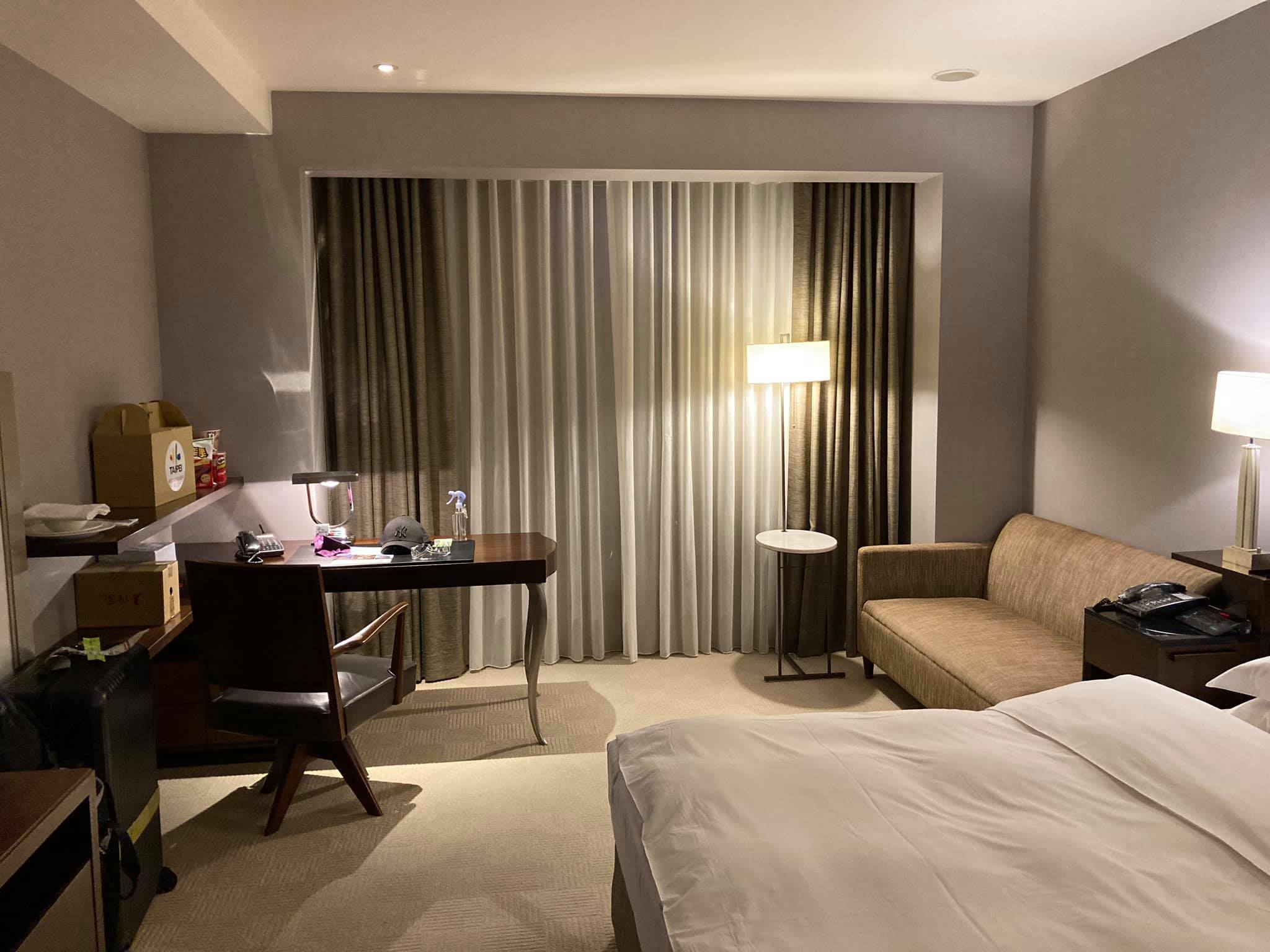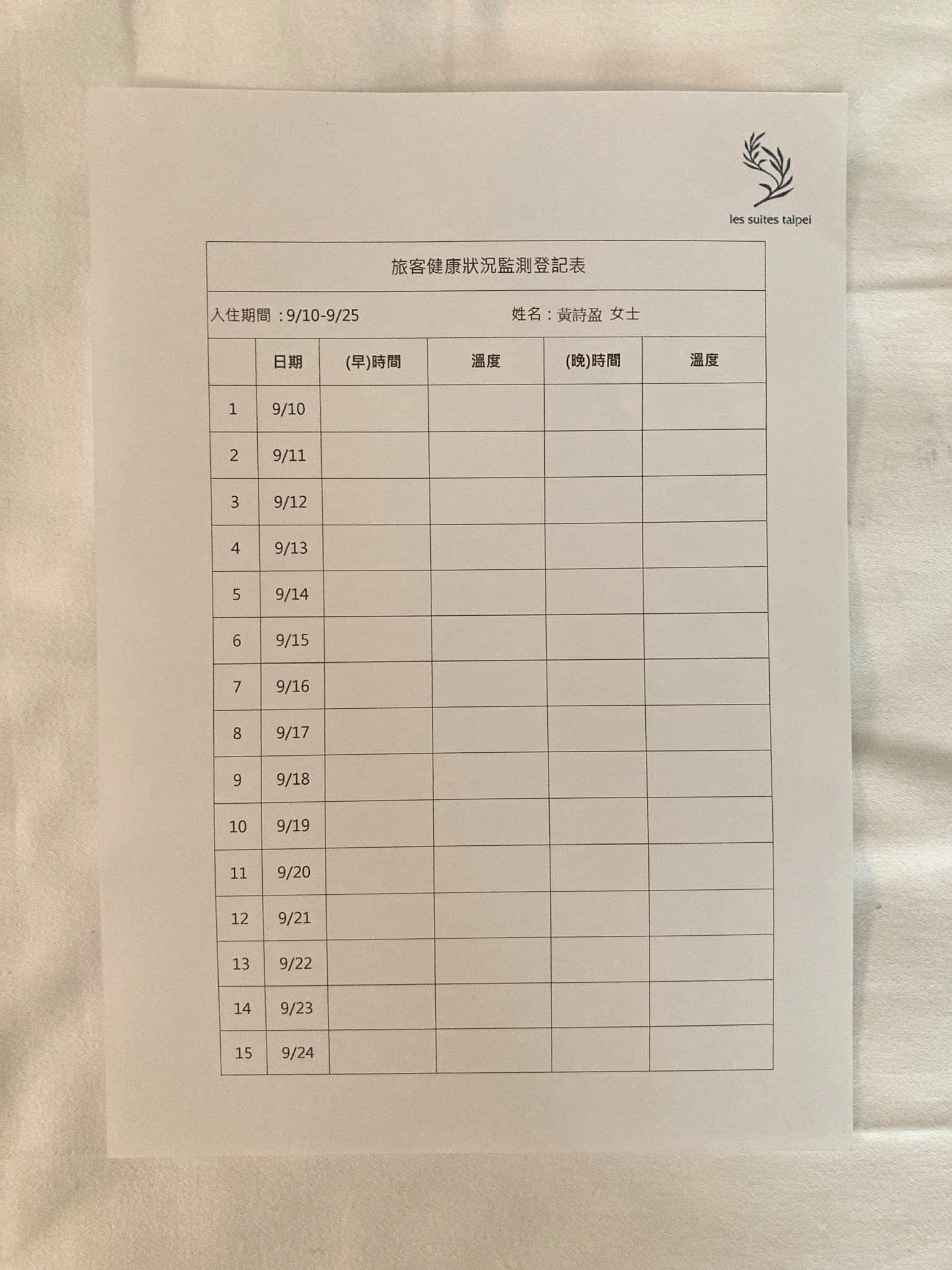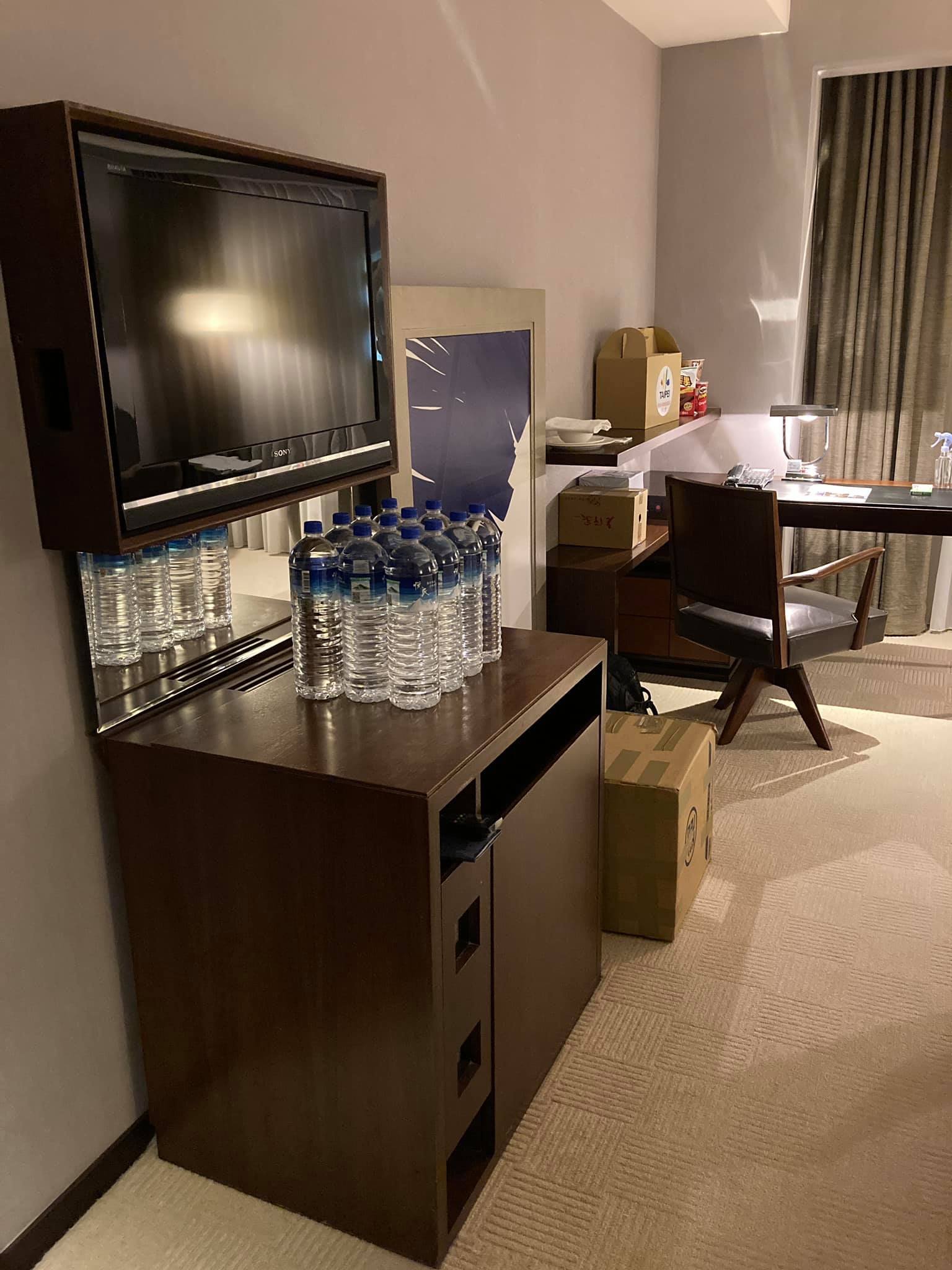 ➡到了飯店大廳後,飯店人員為所有行李噴灑消毒液,幫忙我送行李到房間。我的雙手用酒精消毒,然後飯店人員為我量體溫,確認沒有發燒後,告知房號,並引導我自行上樓進房間。