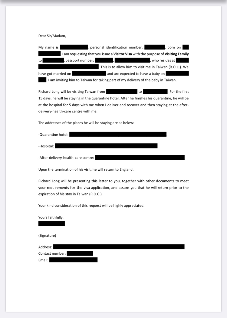 (以下以我用妻子身分申請丈夫到台灣的邀請函為例)