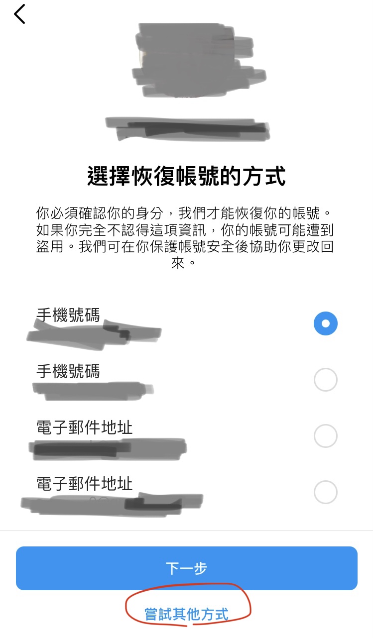 ↓IG在此頁面提供幾個恢復帳號的方式,但如果這些都已經不幸被駭客竄改,則點擊【嘗試其他方式】