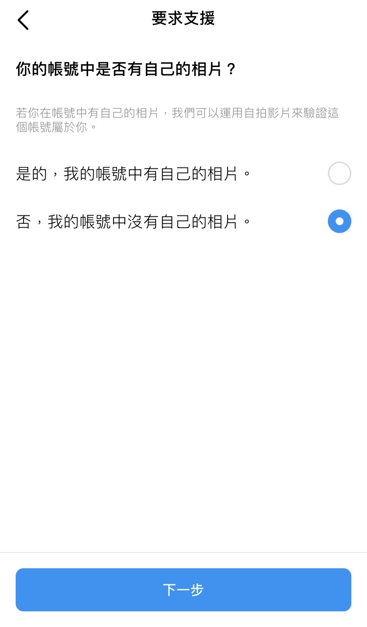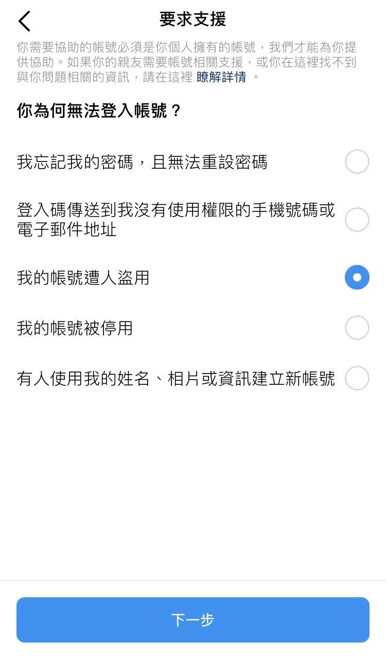 ↓接下來的頁面需提供IG此帳號要求支援的原因,依實際情況點選後,然後點擊【下一步】