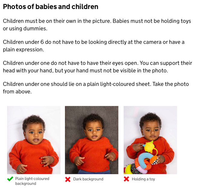 ✎摘要一下重點就是:要淺色背景,寶寶的照片中只能有他/她自己,不能有其他人物或物品,6歲以下的孩子可以笑可以哭可以看別的地方,1歲以下的寶寶甚至可以閉眼睛(所以可能睡覺的時候在床上拍應該不錯?)。
