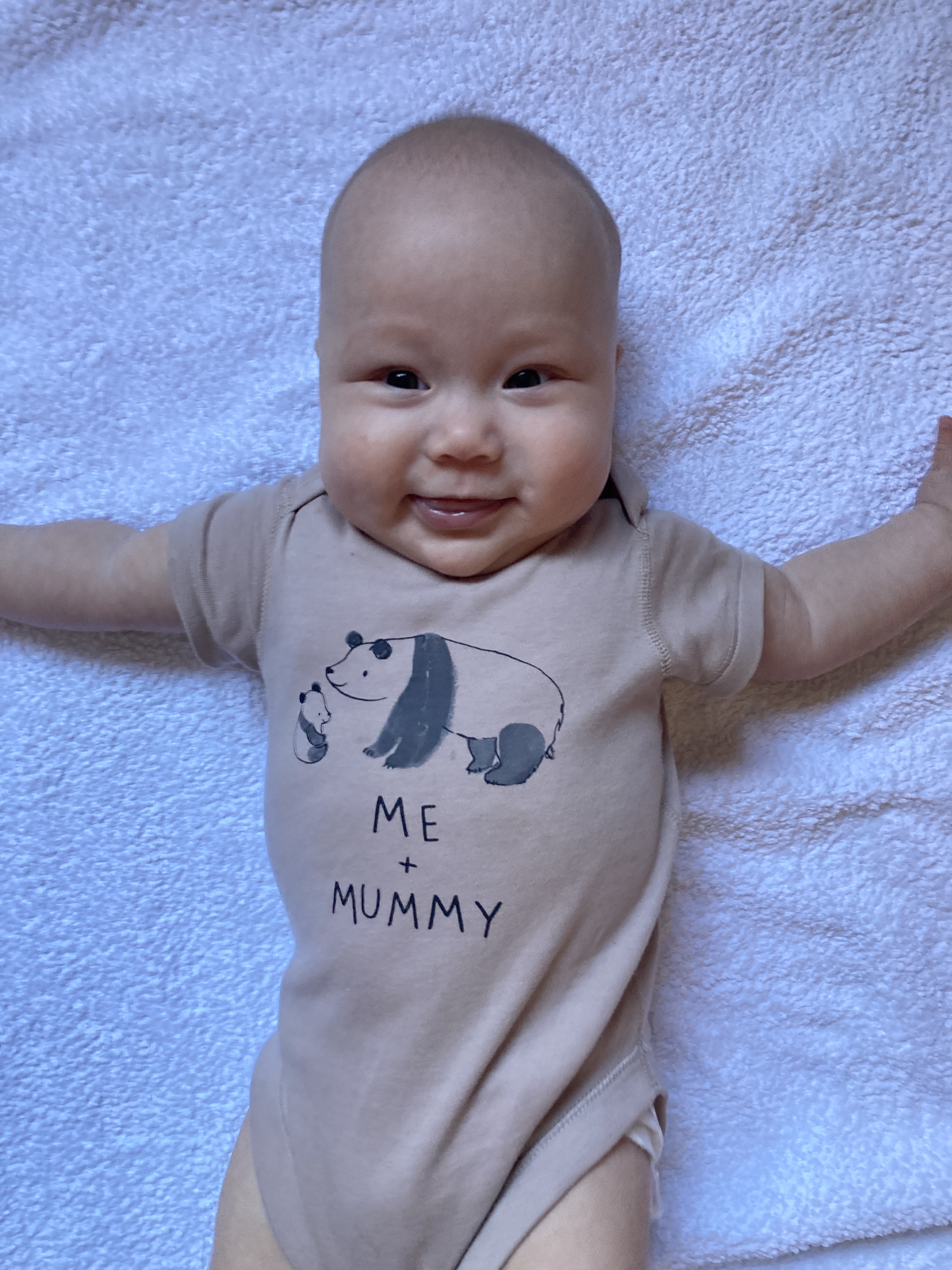 ↓我就在我家地板上舖了一條白色浴巾然後讓龍三躺在上面,逗她笑(因為這可能是她今生唯一一次可以在英國護照上放上可愛笑容照片的機會,當然要好好把握。。。)結果其實蠻快的,我用手機拍了差不多5分鐘就拍到我想要的照片了。