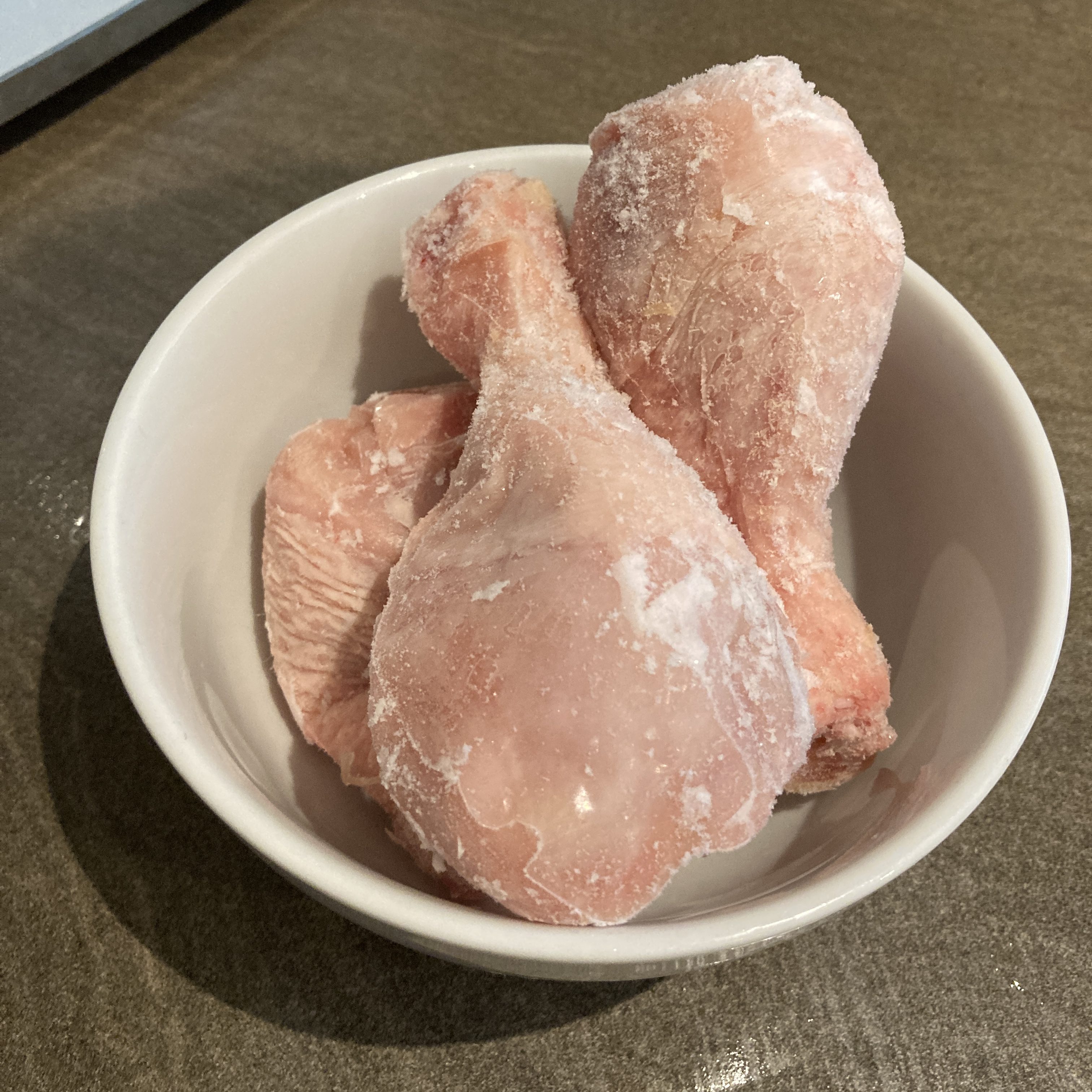 ↓我還早早拿出了3隻雞腿退冰,盤算著我看牙醫回來我們三個人可以一起簡單吃個午餐。