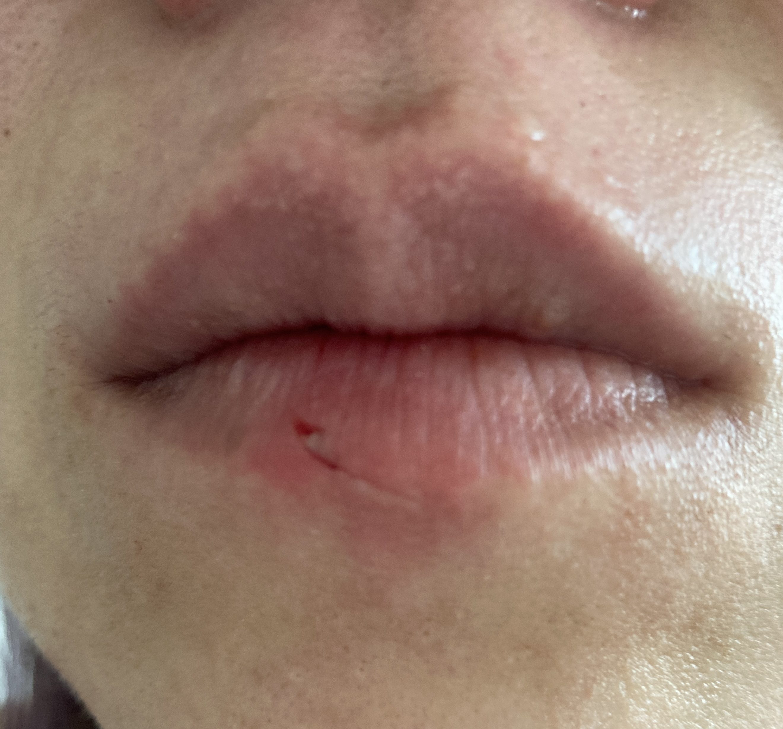 嘴唇外下緣的長型傷疤仔細近看還是看的出來一點點粉紅色。