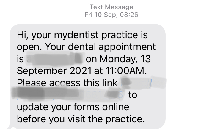 看診前3天,手機簡訊收到了牙醫診所提醒看診時間,並要求在看診前要完成的問卷。