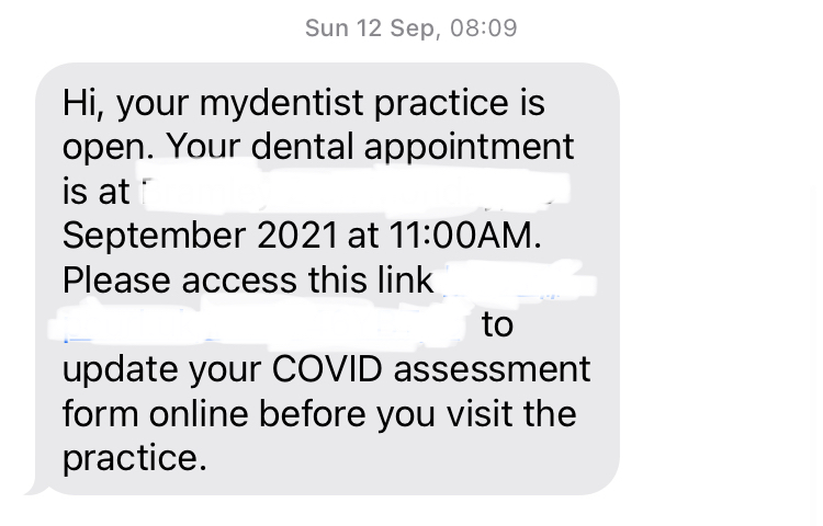 看診前1天,手機簡訊收到了牙醫診所提醒看診時間,並要求在看診前告知武漢病毒的感染或接觸狀況。