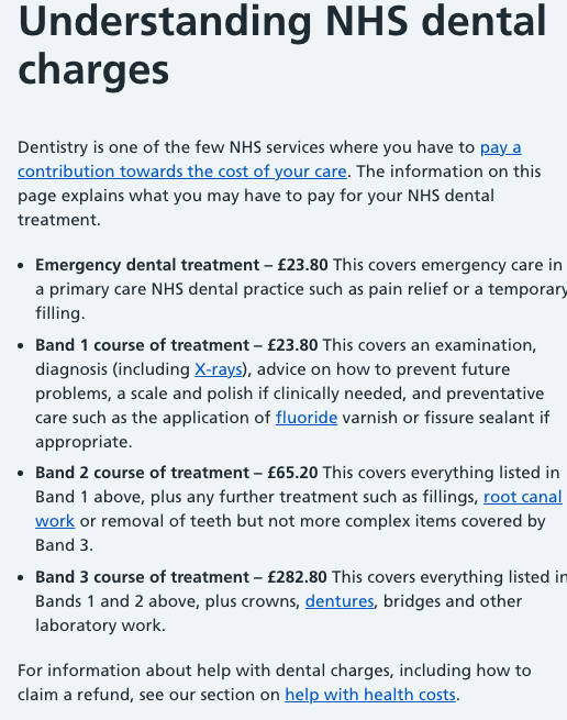 我大概摘要以上NHS網站上載明的牙醫收費標準: