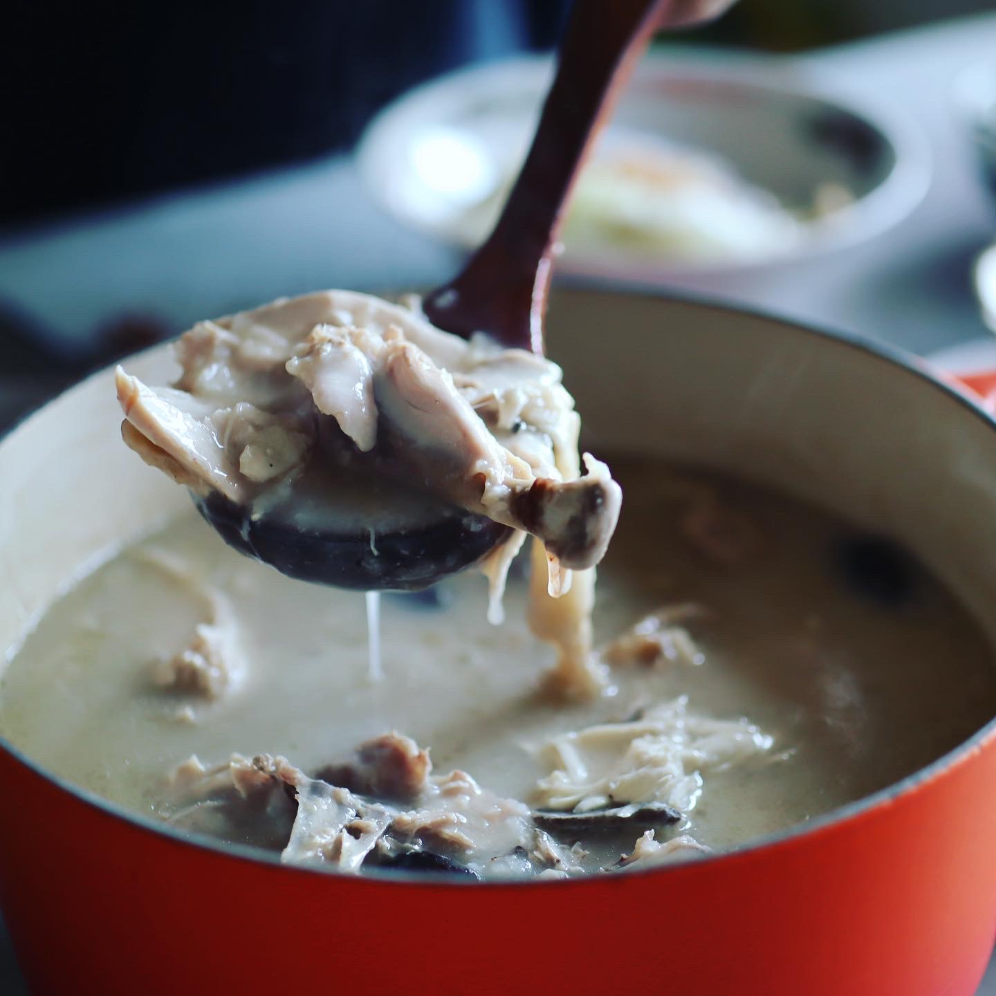 在準備材料之際,不爬文都不知道,一爬文真是長知識!原來正因為糯米雞湯熬煮後糯米會與雞汁融合在一起形成濃稠的糯米湯,不但同時有著雞肉和糯米豐富的營養價值,而且熬到骨肉分離的雞與米交融後的綿密清甜,更是讓人很難不一口接一口地呼嚕下肚,碗底朝天。