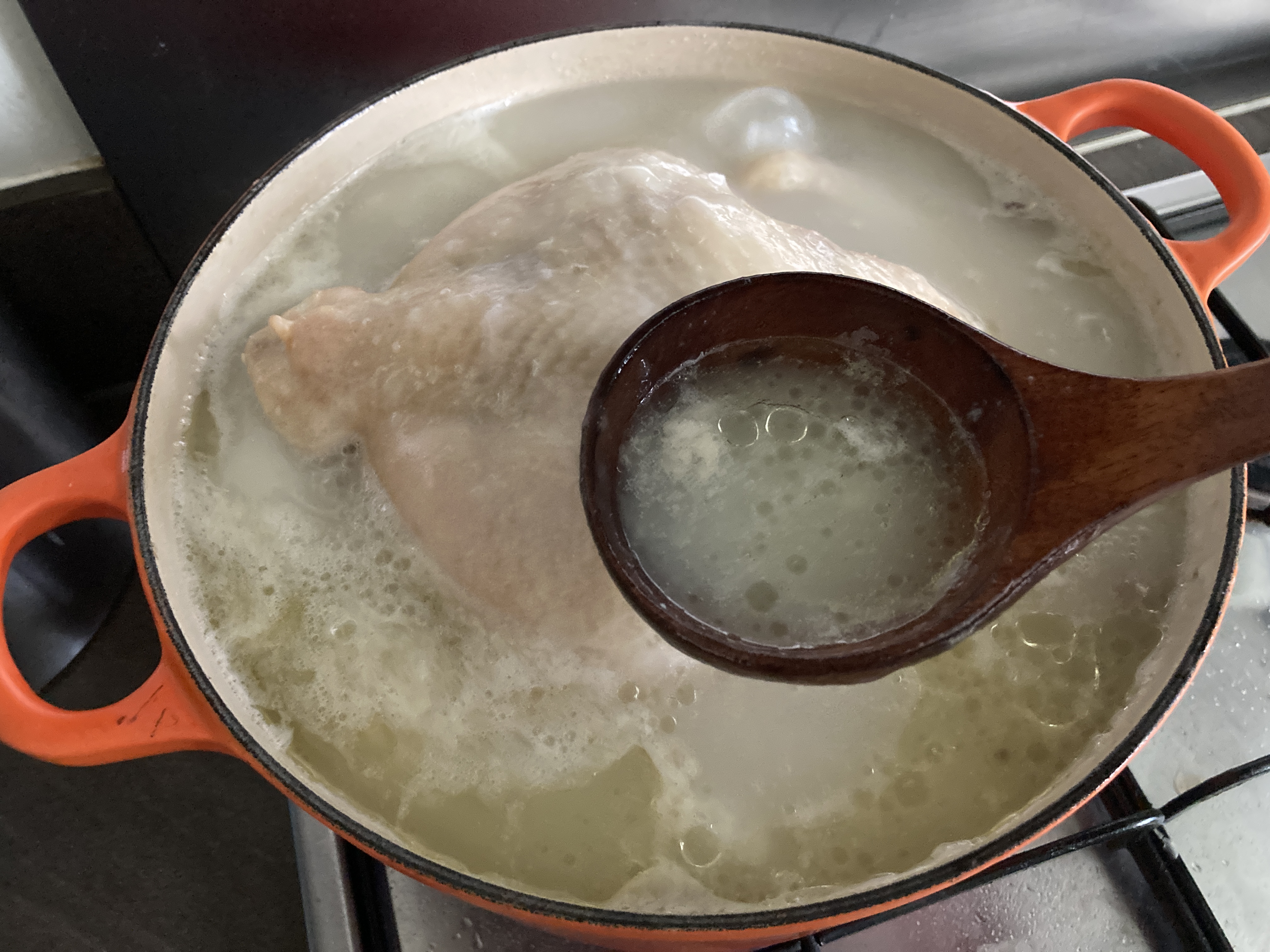 4. 雞放入鍋中,倒水入鍋中淹過雞,大火將水煮滾後蓋鍋蓋,轉中火燉2小時。