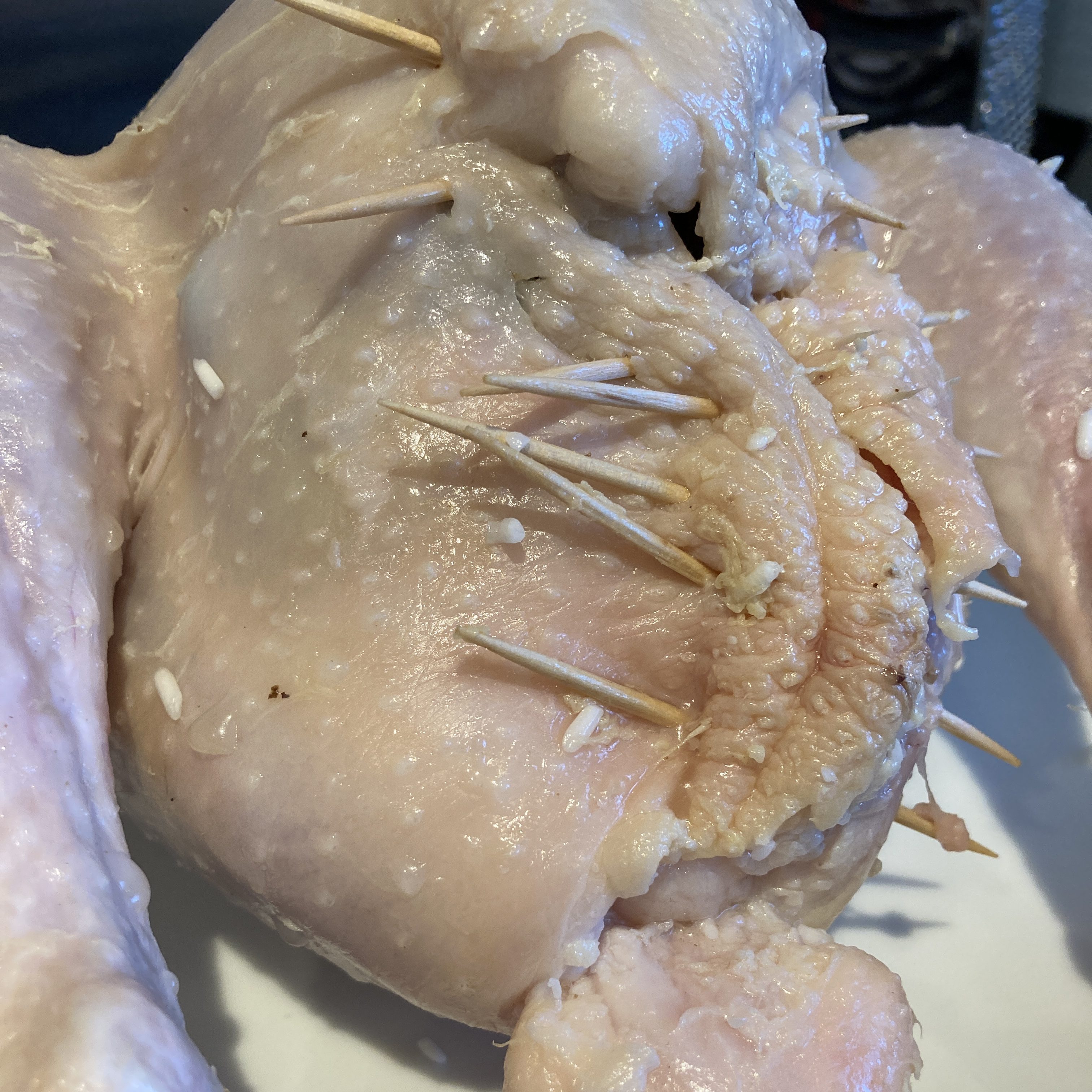 ★以上【 步驟3】:龍外婆都是用針線把洞口確實縫好,這樣食材就不會在燉煮的時候掉出來。但龍媽懶人用懶方法,家裡有牙籤就順手用了。