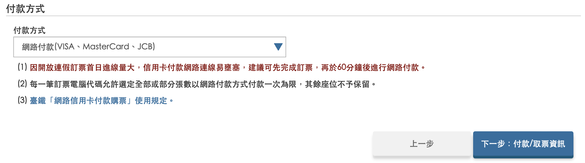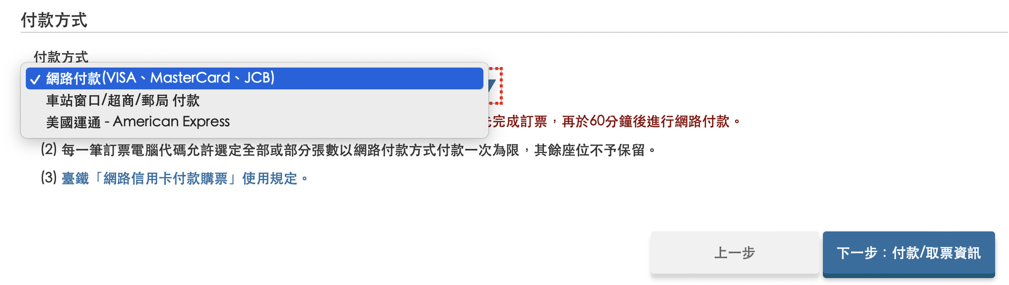 可選擇線上信用卡或車站窗口,郵局或超商付款。