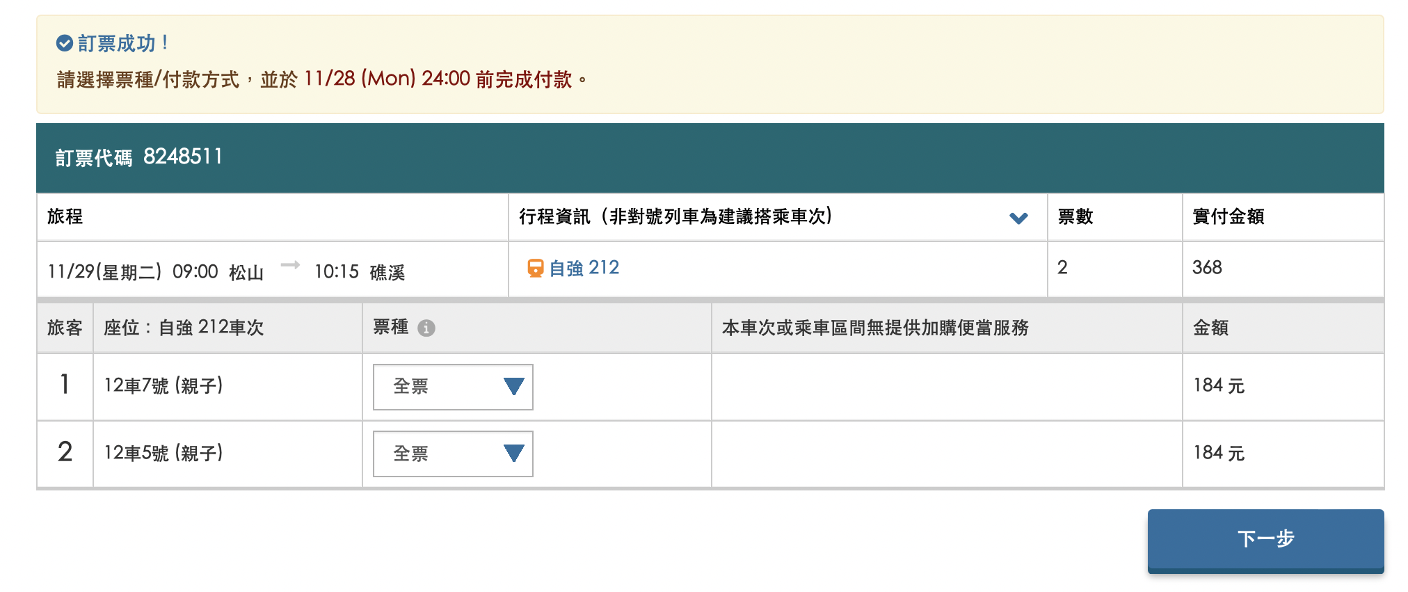 因為這次我們礁溪三天兩夜的小旅行本來就想避開假日人潮,所以週一出發的自強號212班次最適合我們,於是就來果斷訂火車票了。
