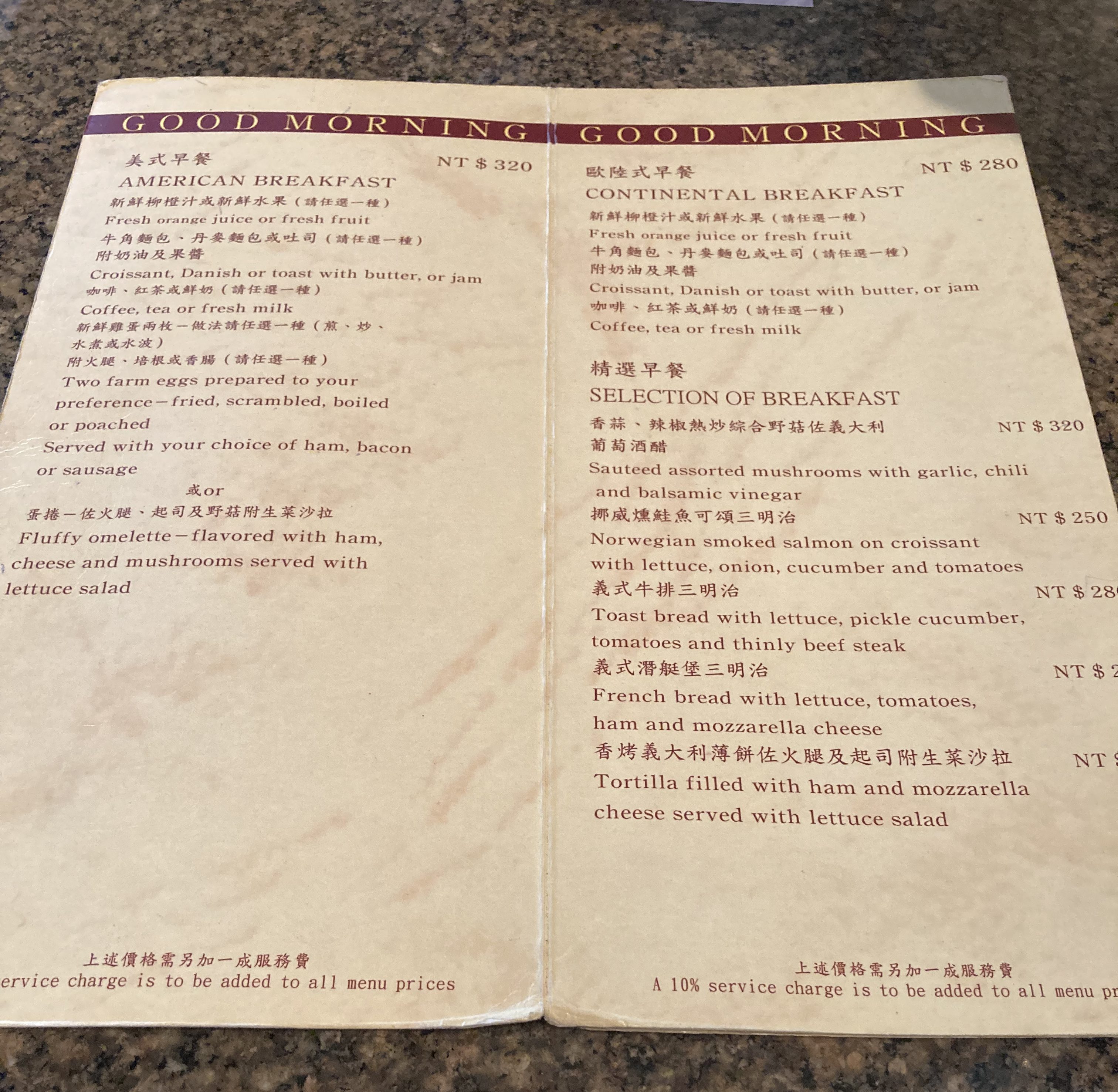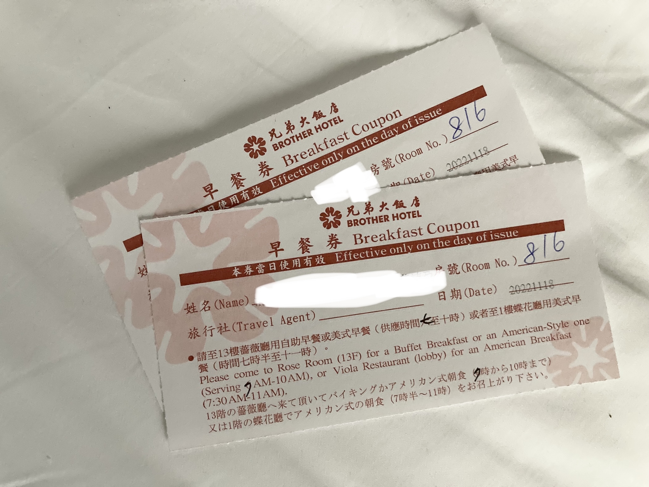 ↓如果訂是有附早餐的房型,每天凌晨飯店人員會把當日的早餐券塞到房間的門縫底下,有西式與台式兩個餐廳可供用餐。