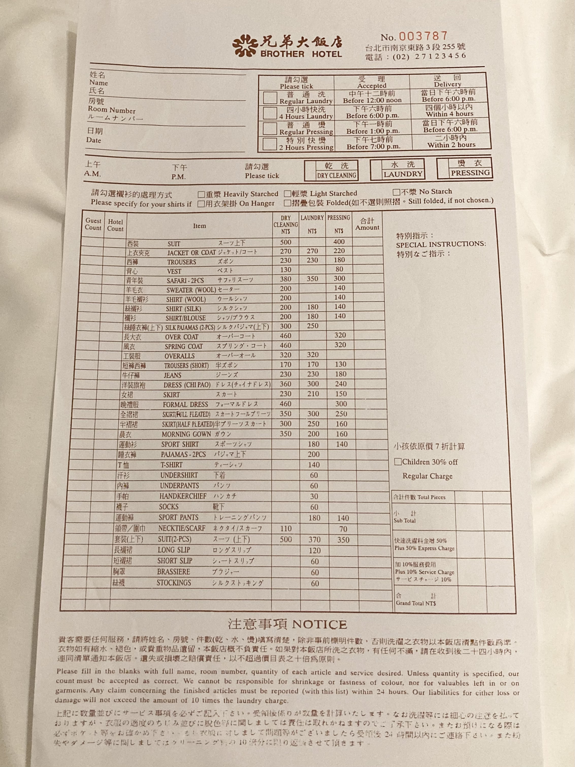 ↓兄弟飯店的洗衣服務價格其實也不是很貴,當時想如果有應急的需求可以試試。