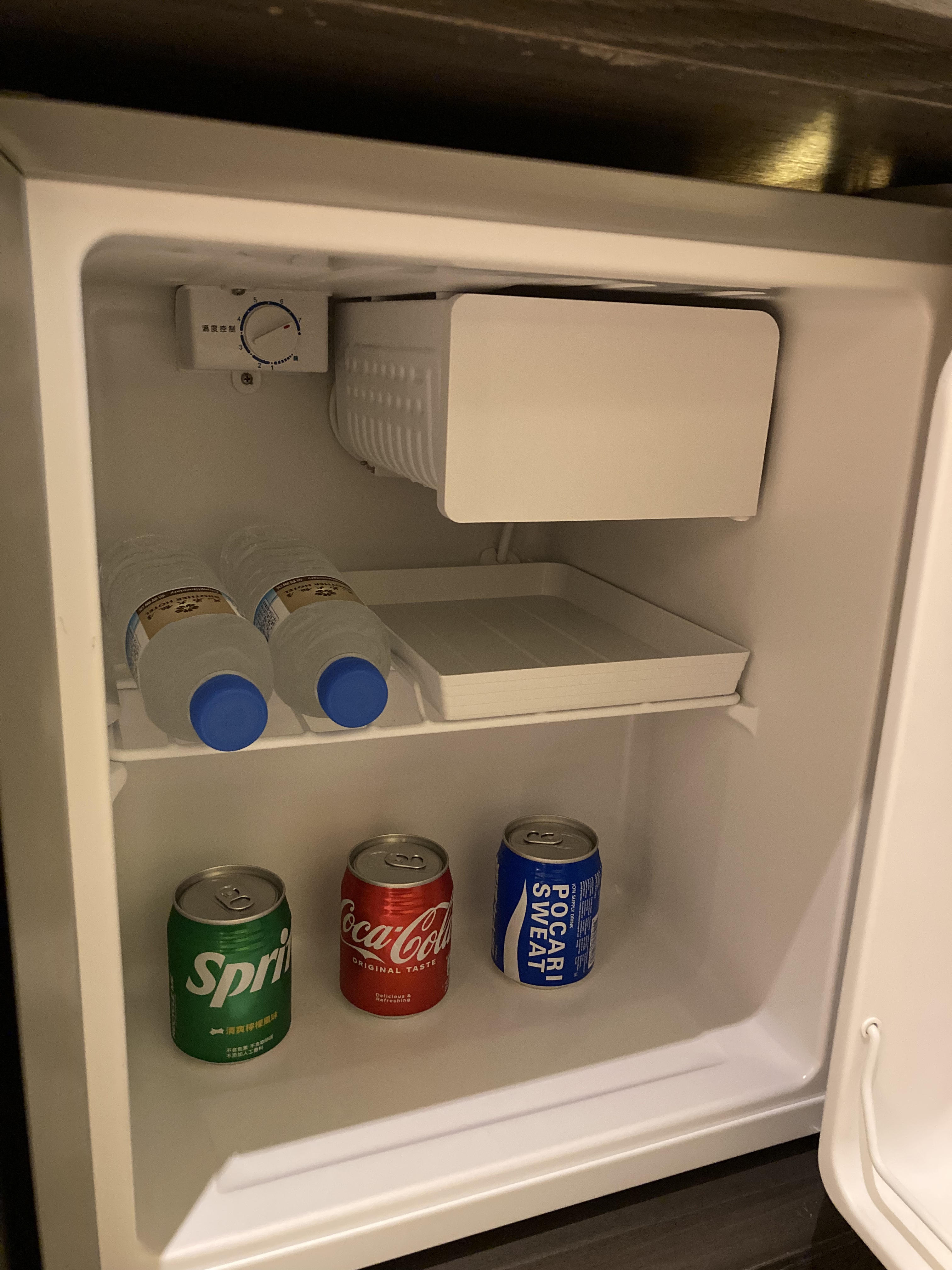 ↓冰箱中附有免費飲水和飲料。