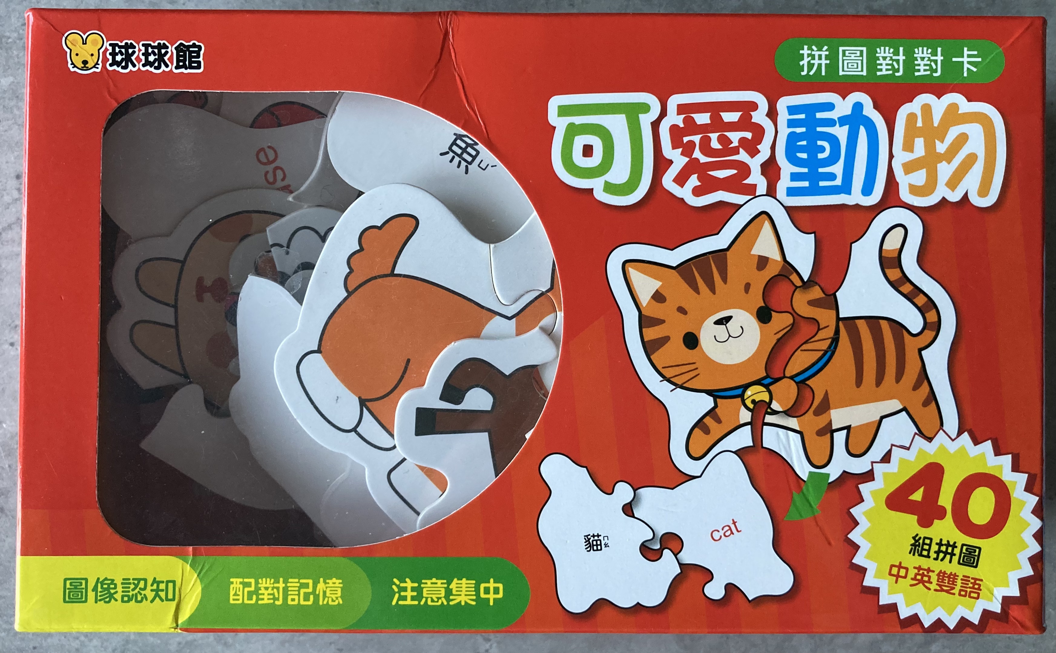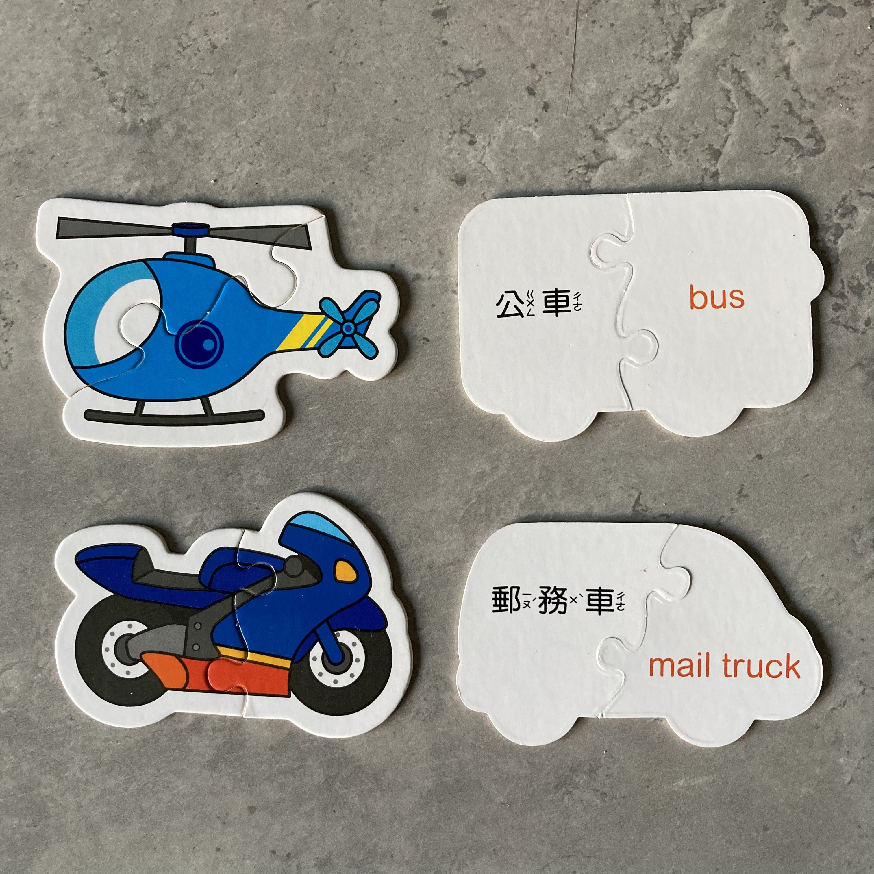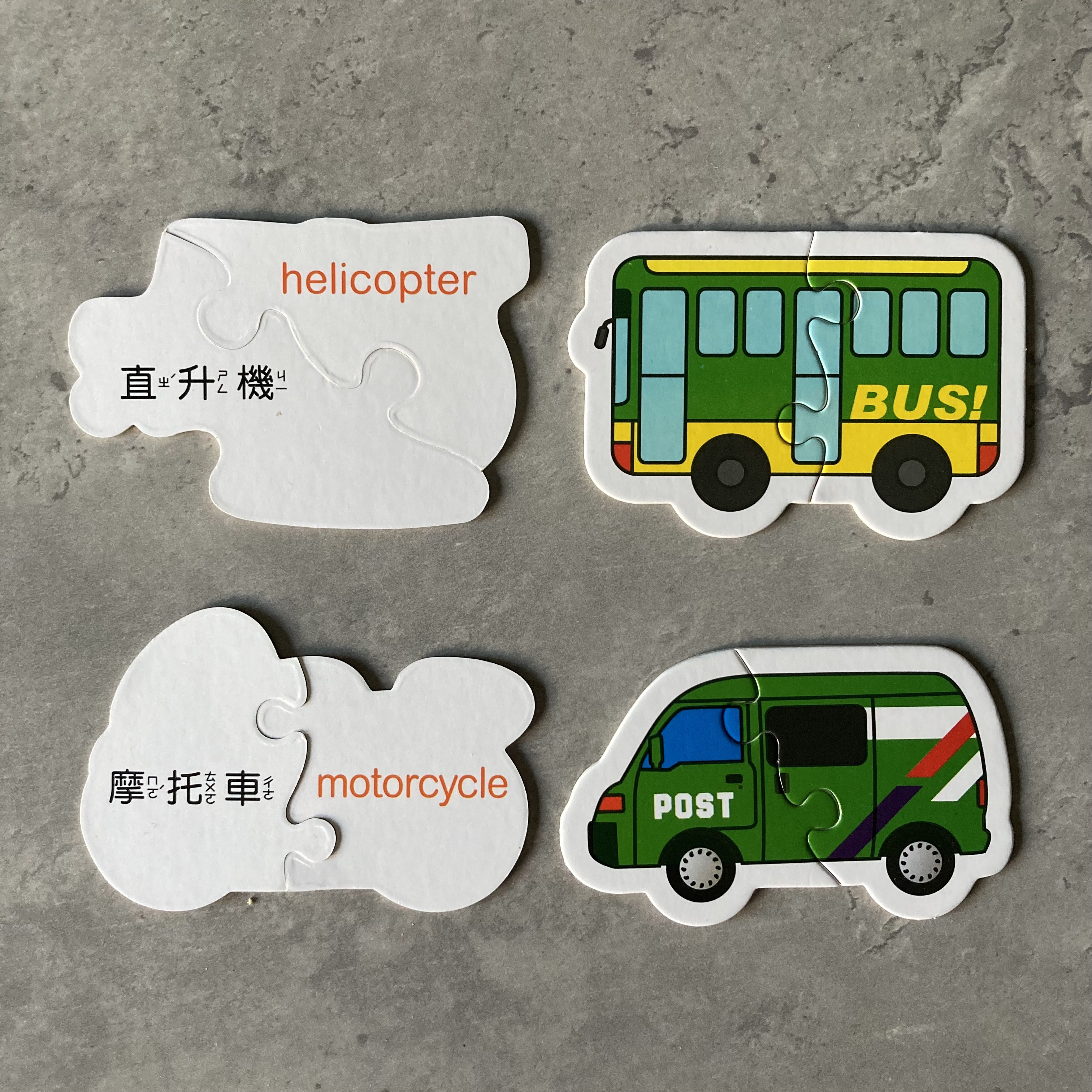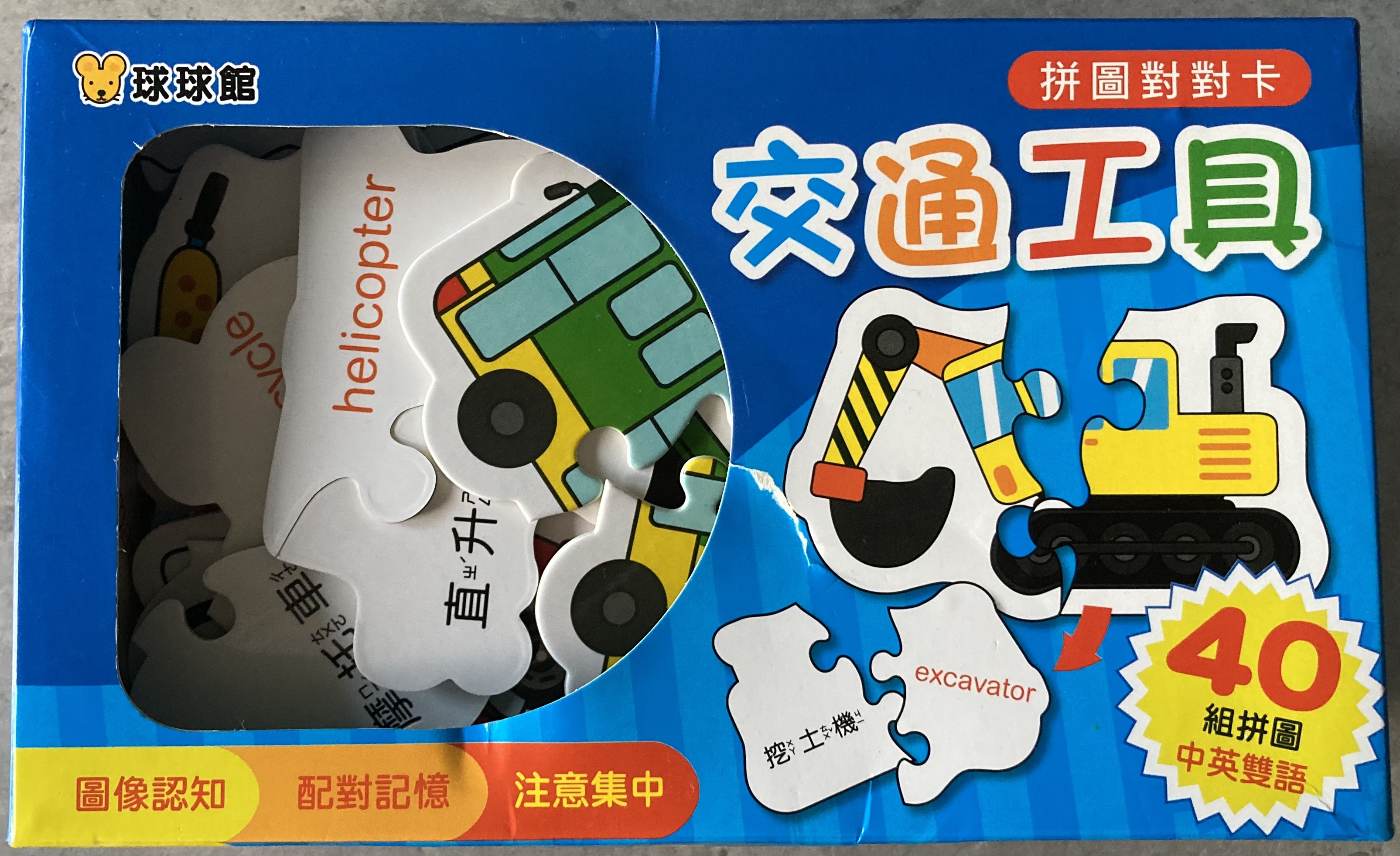 此時購買拼圖選擇的方向是,動物是大部分孩子都有好感的主題,而龍三又特別喜歡各種車子,所以當我發現這款印有國英雙語的拼圖的時候,我就選了「可愛動物」和「交通工具」2種主題。