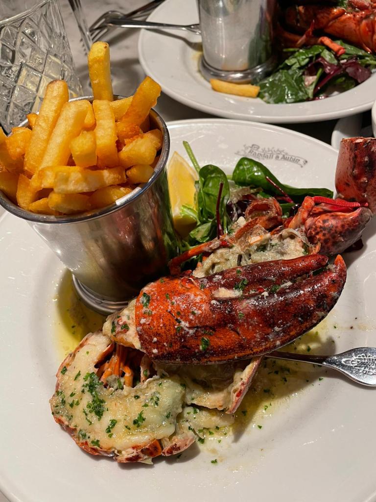 ↑ 我們點的主餐:2份半隻龍蝦 (Lobster roasted in garlic butter with pommes frites; half 375 gms / 奶油蒜味烤龍蝦佐薯條,半隻 375克,£35.00)