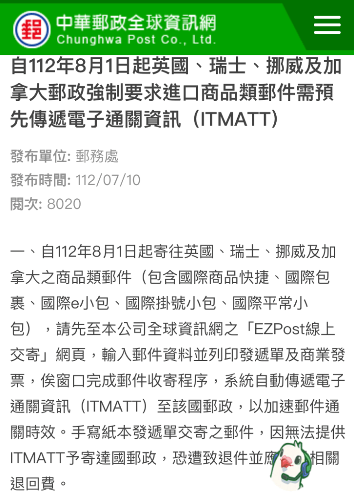 什麼是ITMATT 呢?就是所謂的「國際郵件電子通關資訊服務」