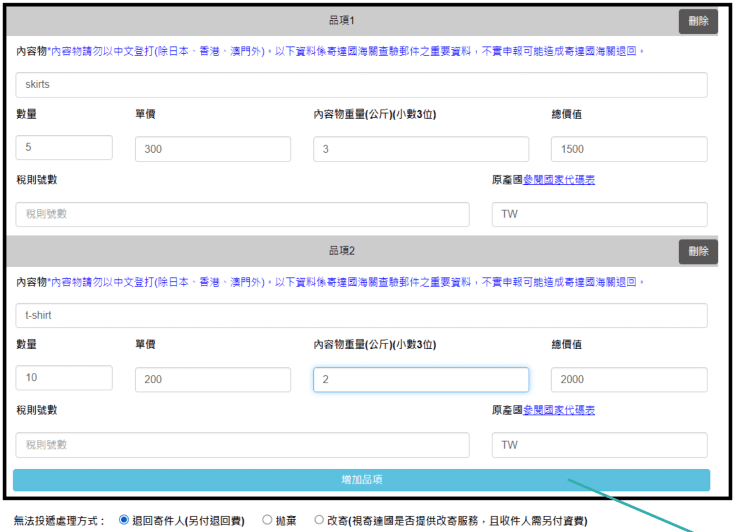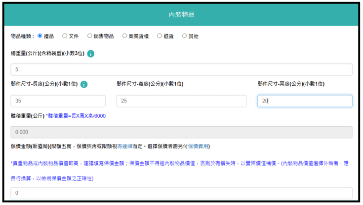 在郵寄的時候,熱心的郵局大姐有提醒內容物要一五一十照實填寫,包括材質數量與產地等等
