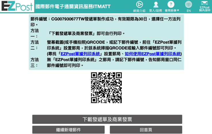 ↓ 如果要到郵局列印的話,需要截屏保留畫面上的二維碼(QR code),或記下編號到郵局使用這台 【EZPost郵寄便】單據列印系統的機器列印