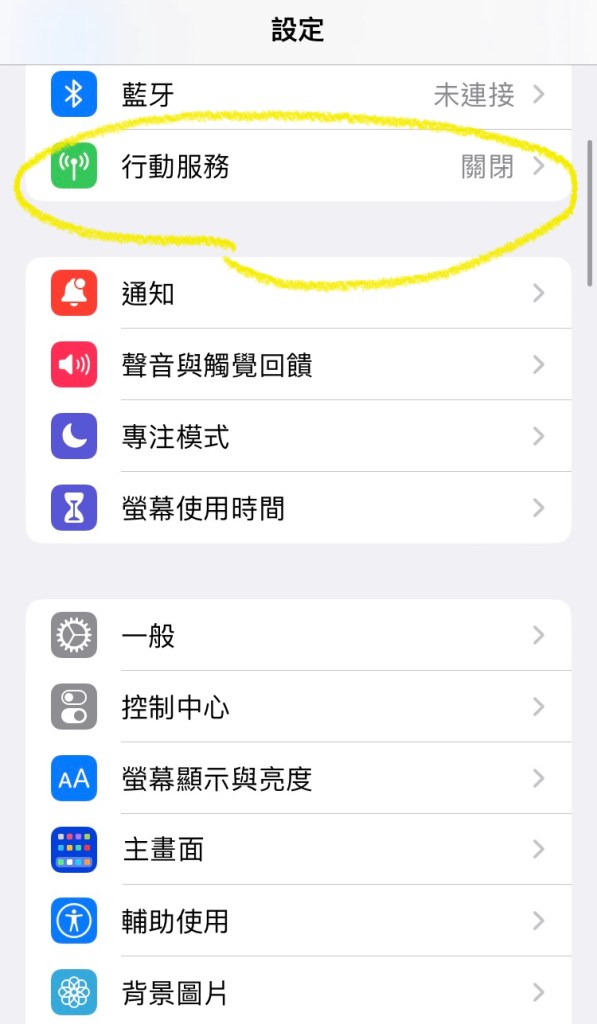 ↓ ① 設定> ② 關閉行動服務 / 行動數據