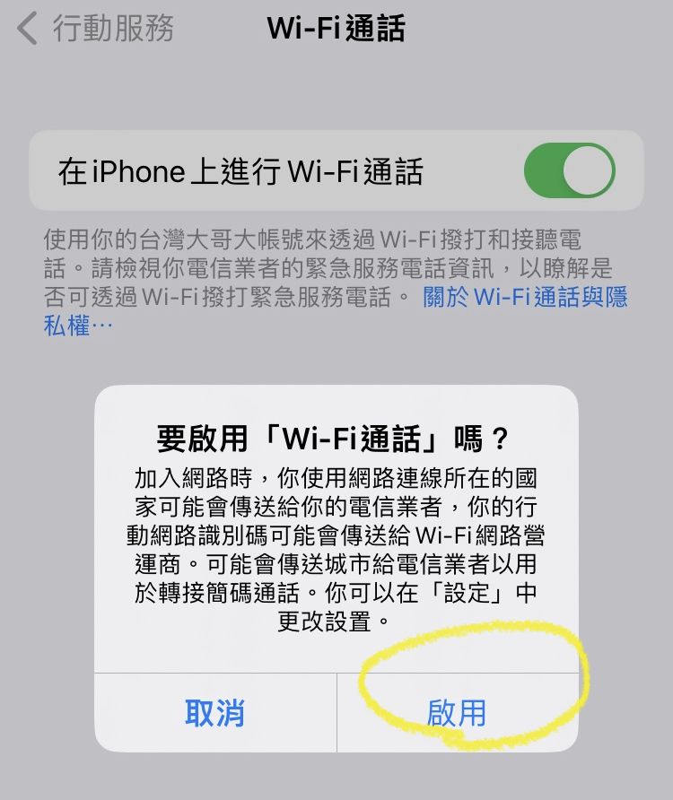 ↓ ④ 點擊確認在iphone上進行wifi通話