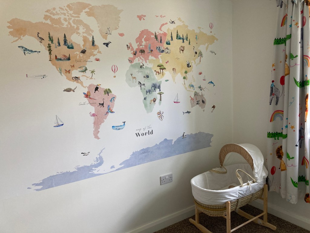 後來被我在Etsy上找到了這幅長寬幾乎和牆壁面積完全符合的地圖,更令我開心的是可愛的動物彩繪也符合了房間的主題!重點是整體都沒有用顏色劃分國家,而且台灣還被意外的畫的蠻大的哈哈,實在滿意極了!不得不說整個佈置房間的過程簡直就像東市買駿馬,西市買鞍韉的概念,但看著房間慢慢從空無一物到逐漸完整,真的越來越期待房客的入住 (aka女兒的誕生)!