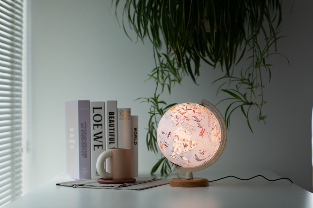 而這也不是一顆普通的地球儀!白天自帶粉彩的色調,佐以高質感木紋底座,平日擺放於家中可作為居家佈置賞心悅目,還能搭配動物圖騰有助學習。入夜後三段式不同LED燈光可營造不同場景,更是黑暗中一盞療癒系的明燈!